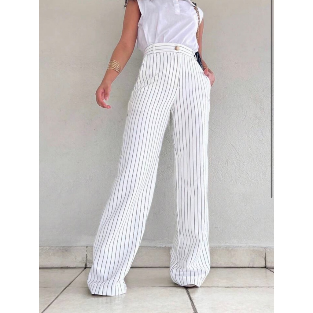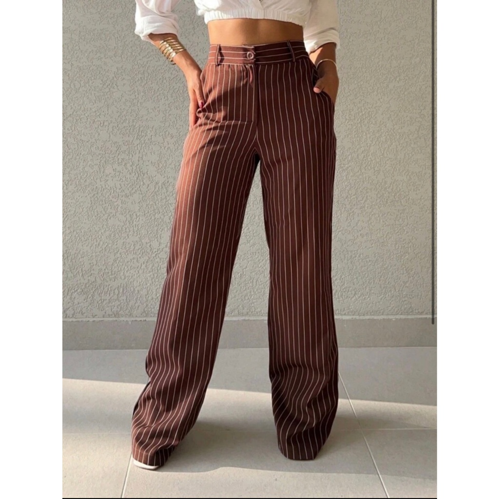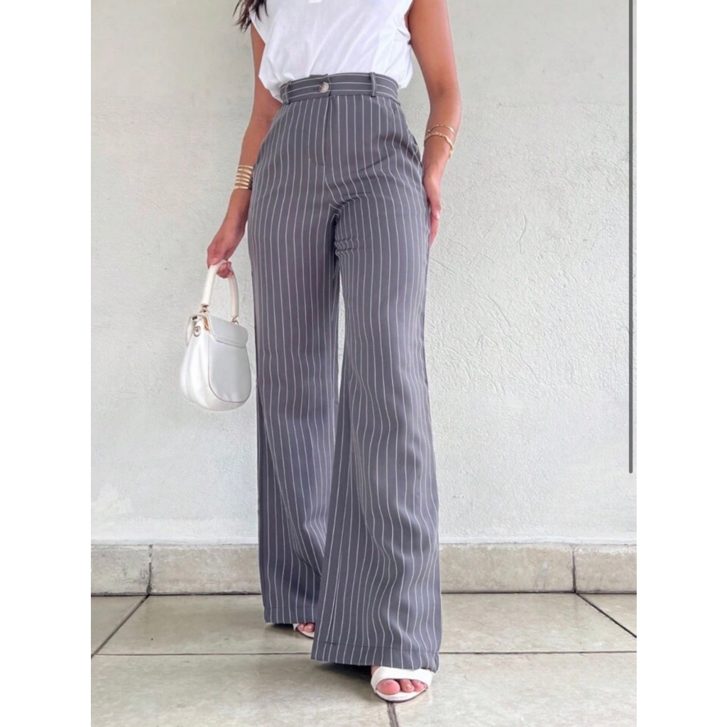 Calça Alfaiataria Pantalona Feminina Giz Cintura Listra Alta Com Bolso Wide Leg