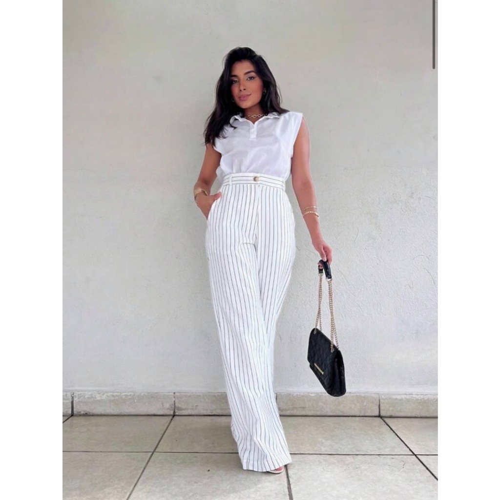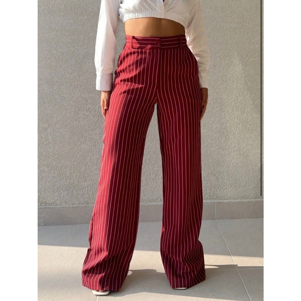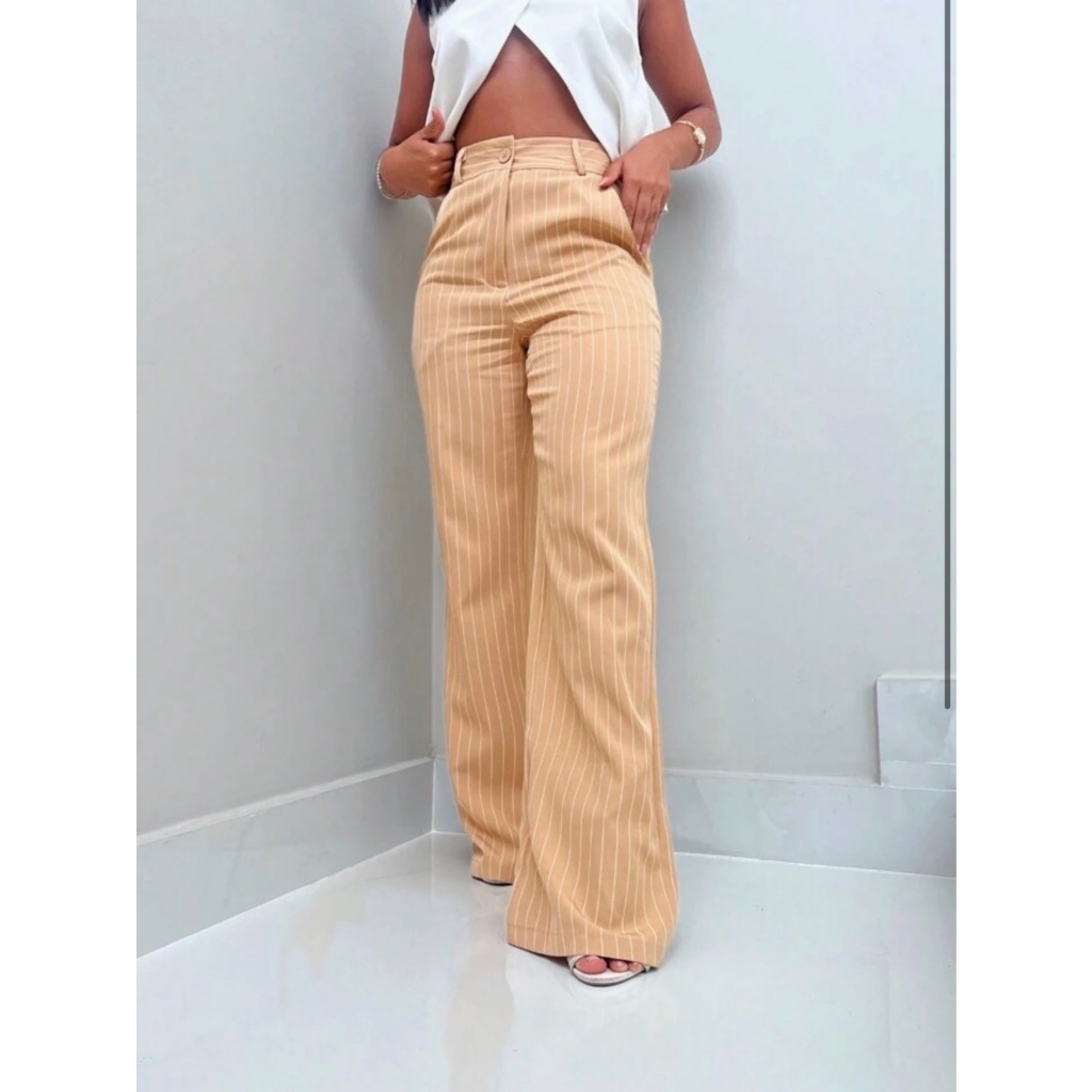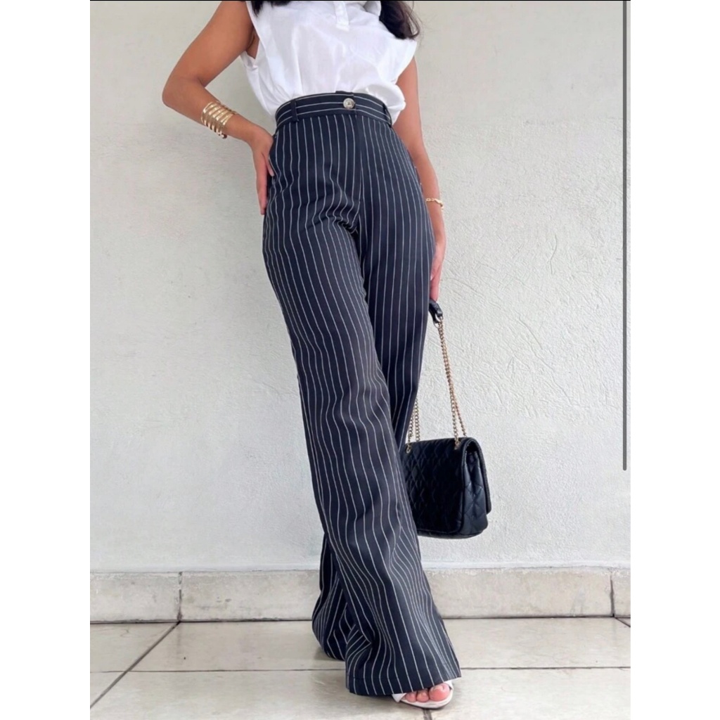 Calça Alfaiataria Pantalona Feminina Giz Cintura Listra Alta Com Bolso Wide Leg