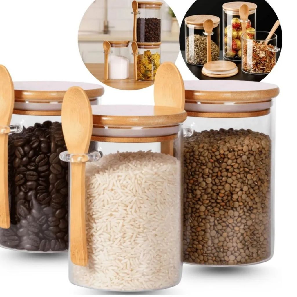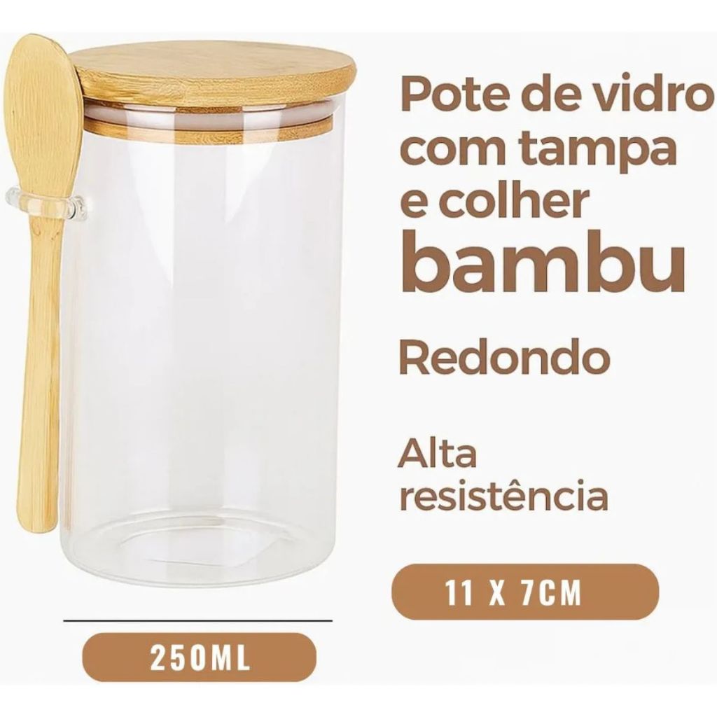 kit 5 ou 10 Potes de Vidro redondo 250ml Borossilicato Hermético Tampa E Colher Bambu