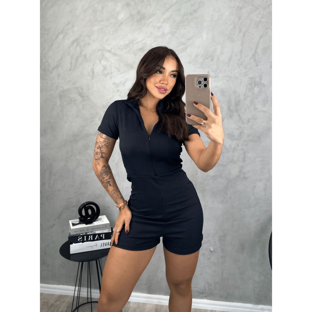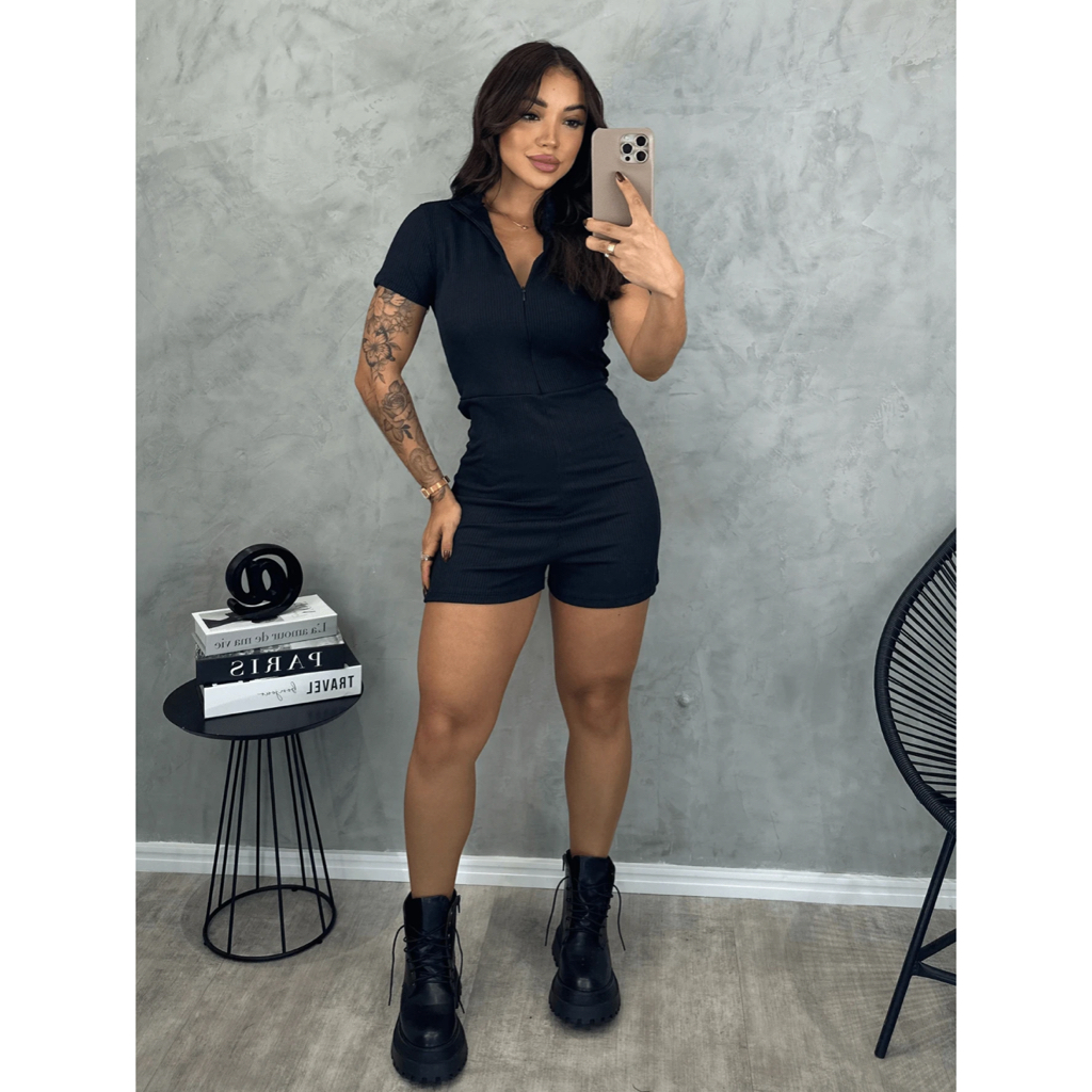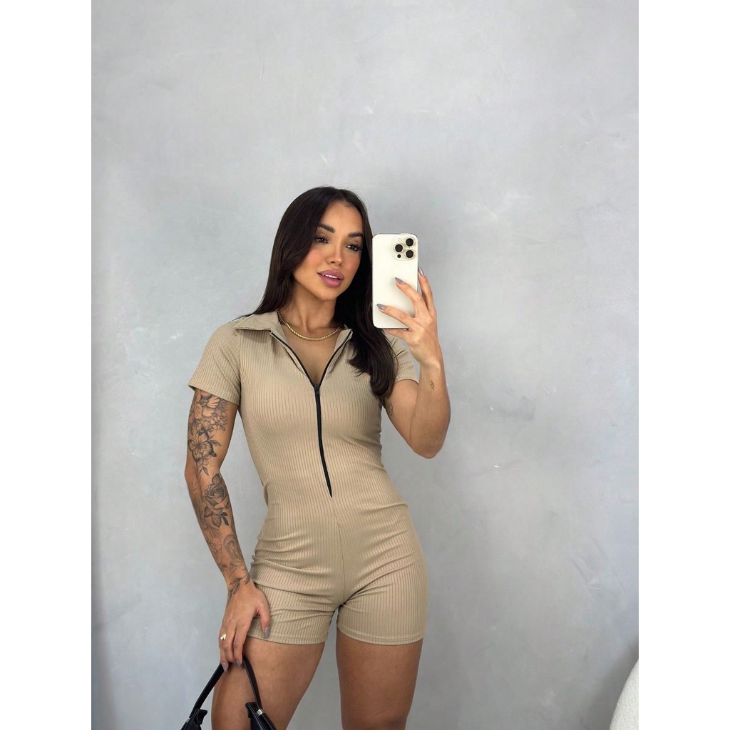 Macaquinho Feminino Curto Canelado Fechamento Ziper Frontal