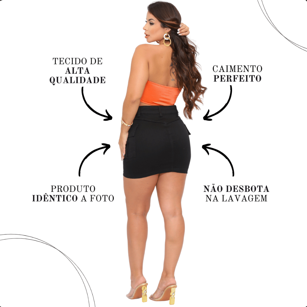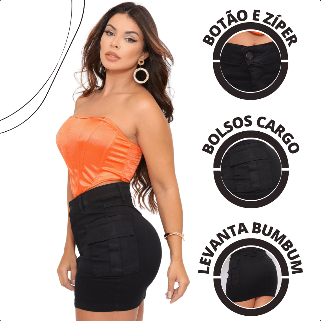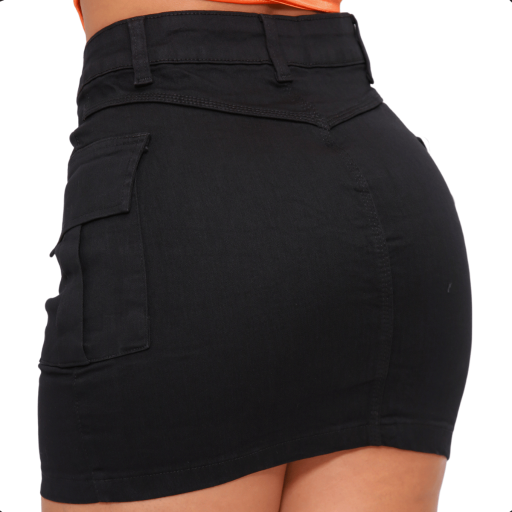 Saia Cargo Preta Feminina Cintura Alta Bolso Lateral Jeans