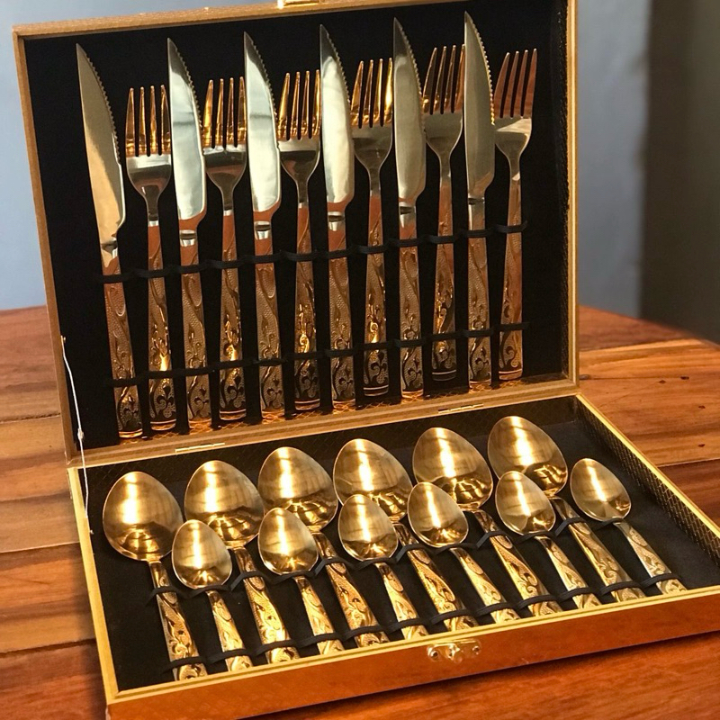 Kit Jogo Faqueiro inox 24 Peças Com detalhe Duorado + Maleta Aproveite