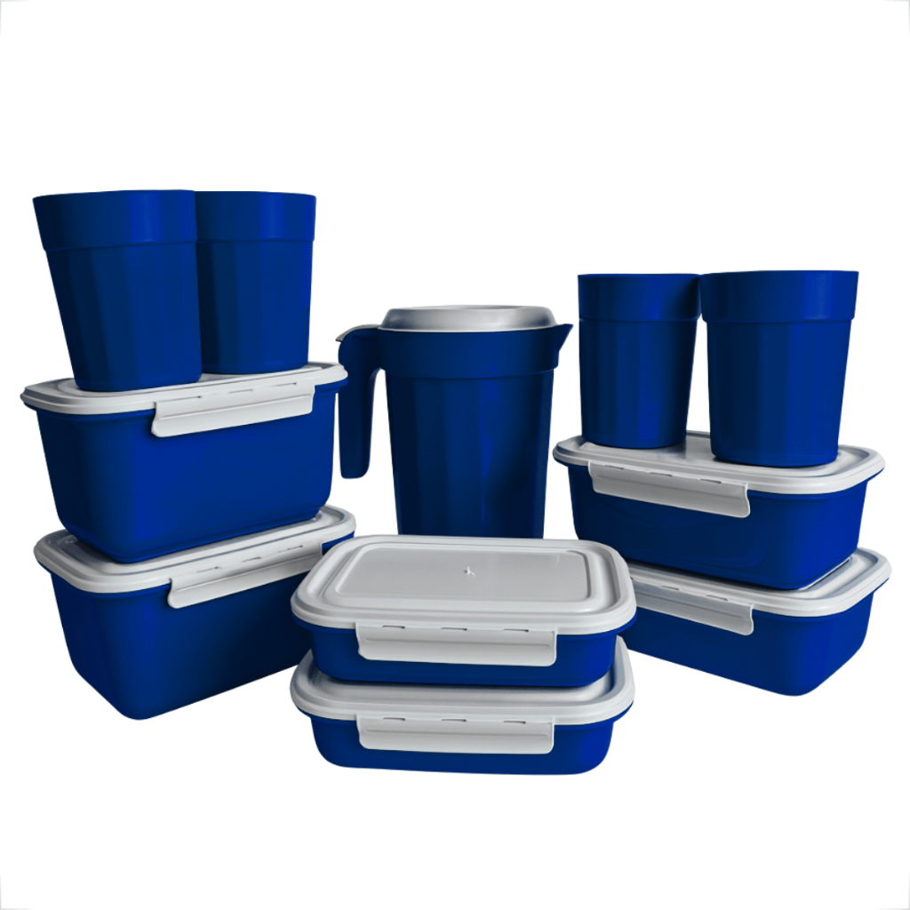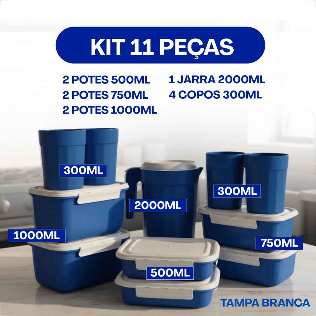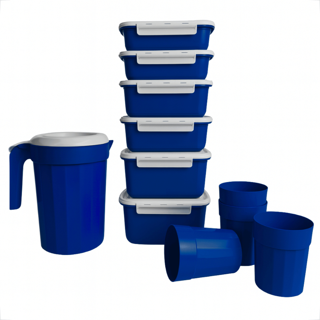 Kit Completo Cozinha 11 Peças – Potes, Copos e Jarra Plástica com Tampas Brancas