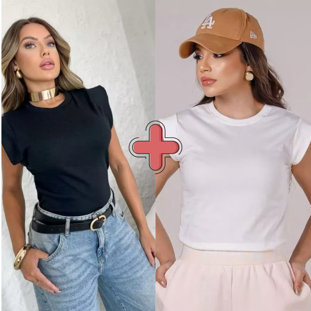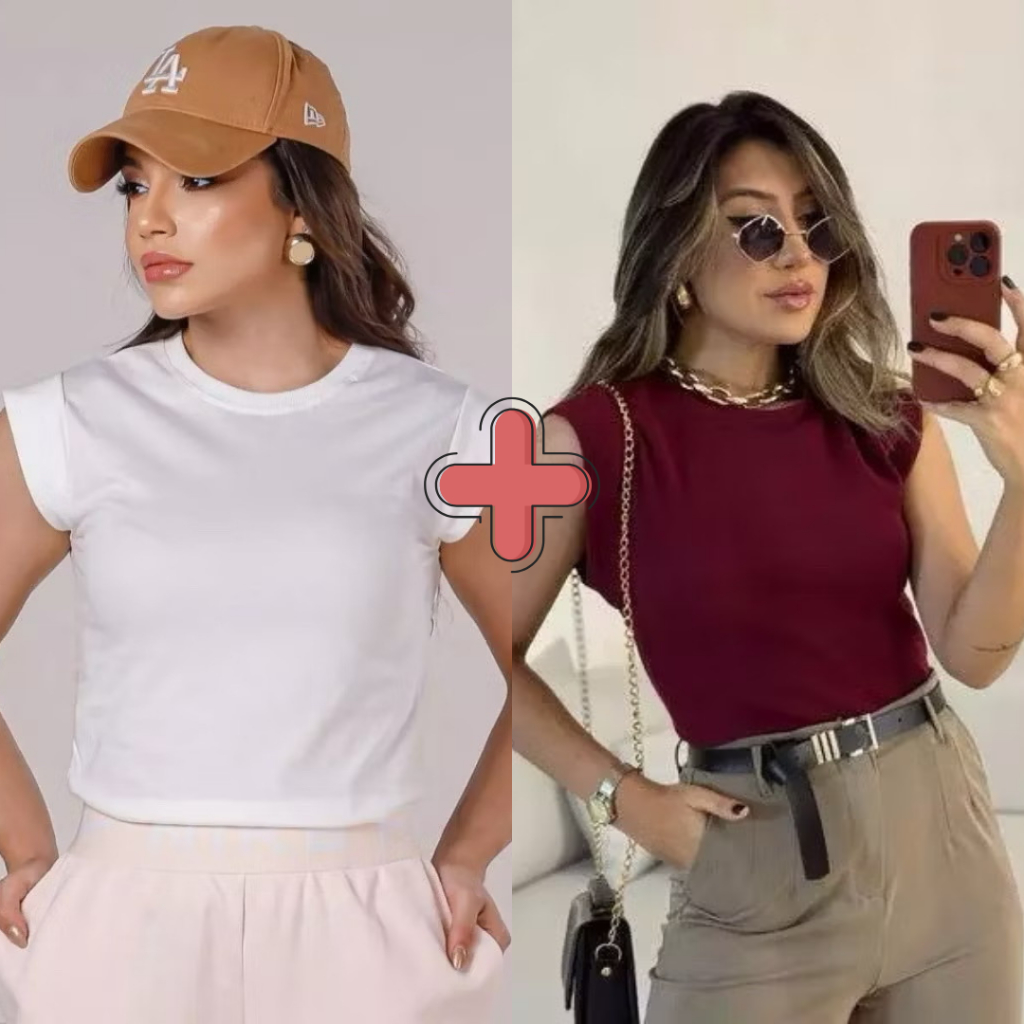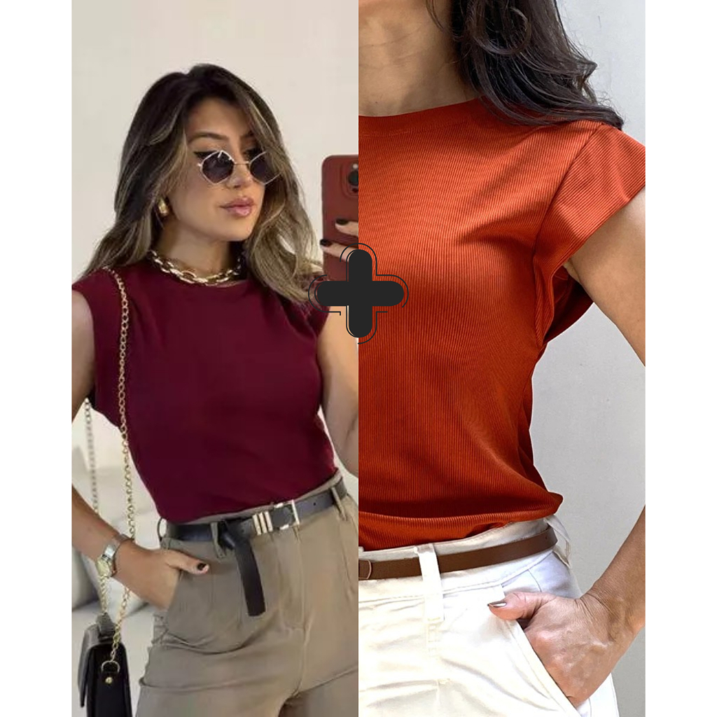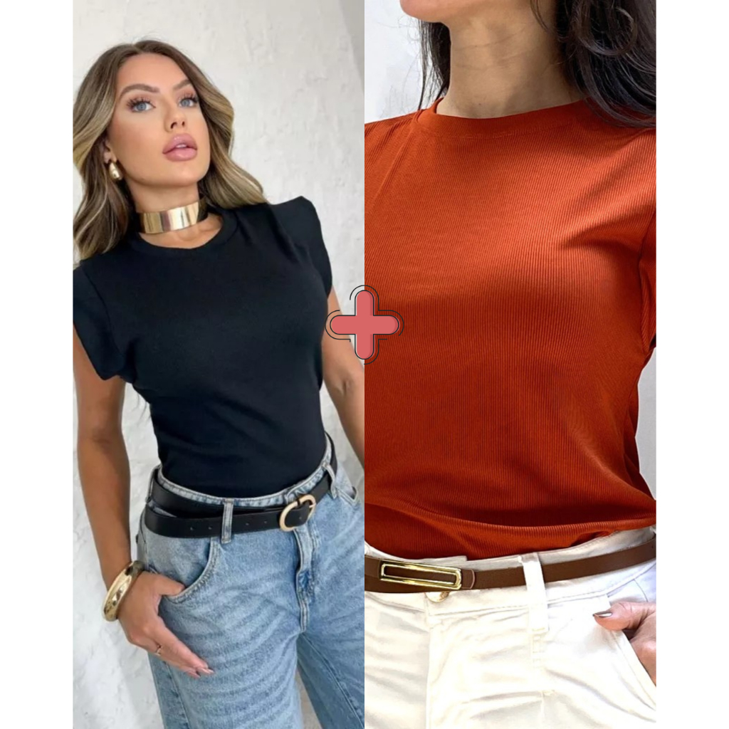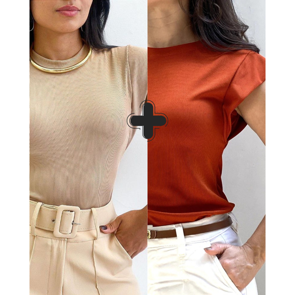 Kit 2 Blusas Femininaa Muscle Tee Lisa Ribana Canelada Gola Redonda Básica Social Elegante