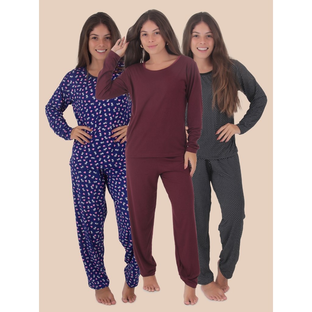 Kit 3Pijamas Feminino de Inverno Manga Longa Click Mais Bonita Outono/inverno