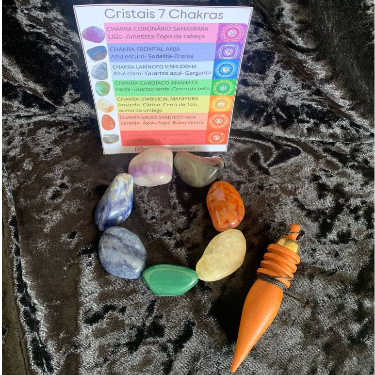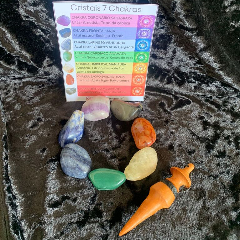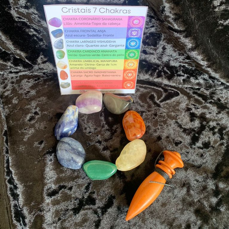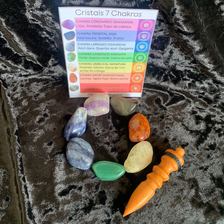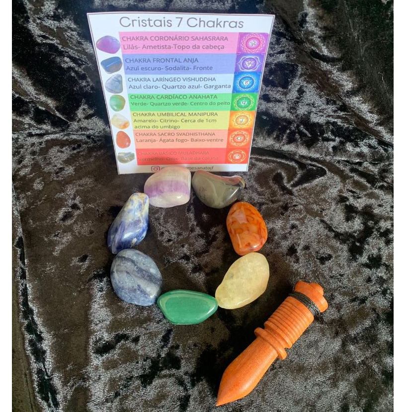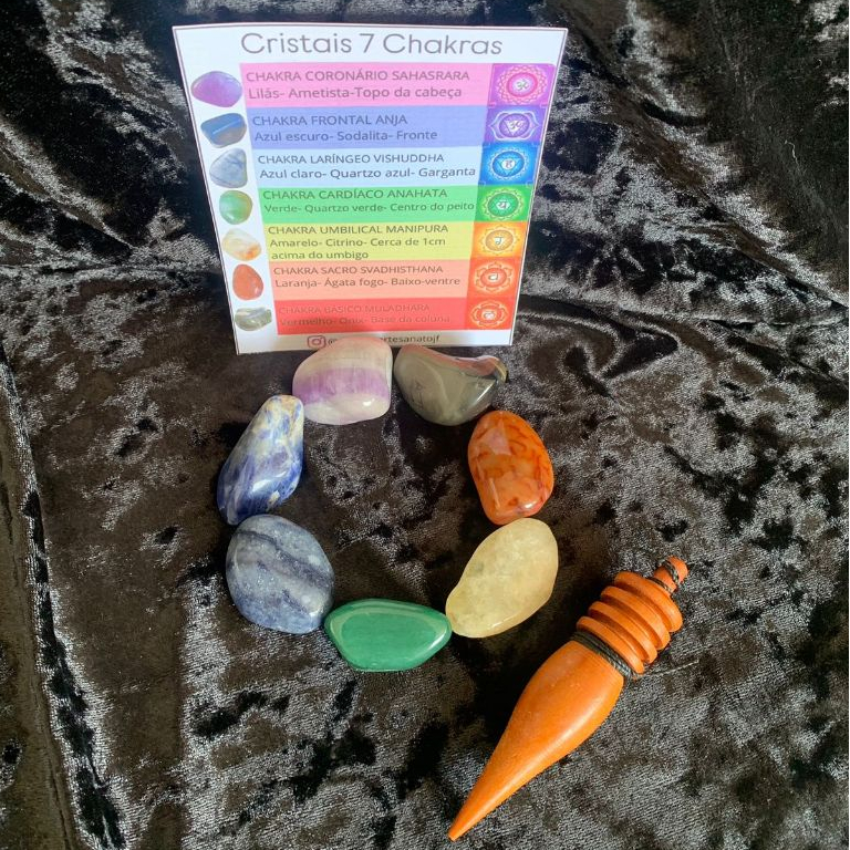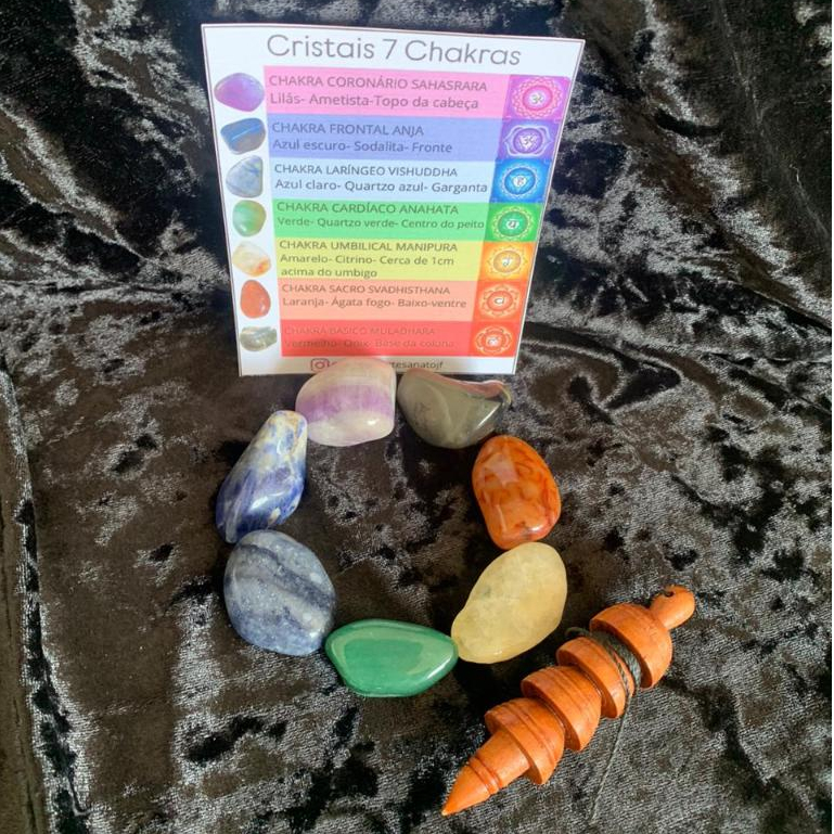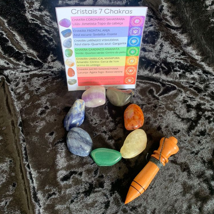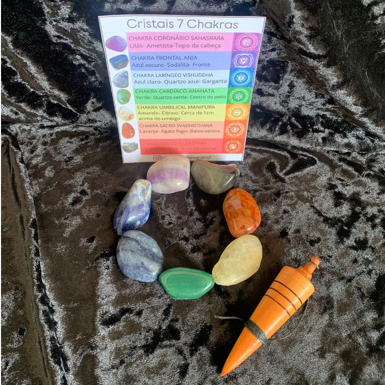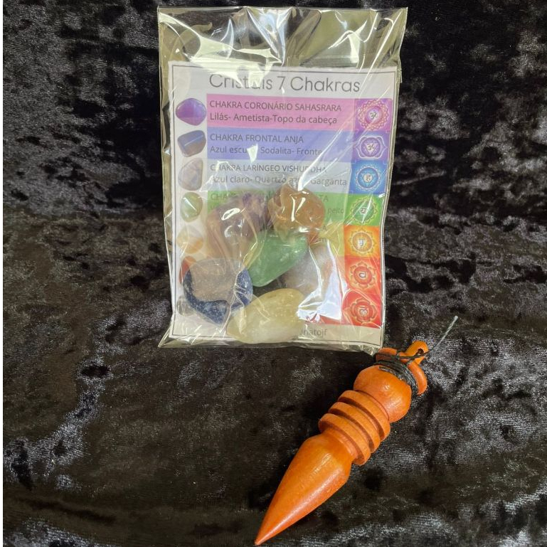 KIT 7 CRISTAIS CHAKRAS E PENDULO DE MADEIRA COM CHUMBO