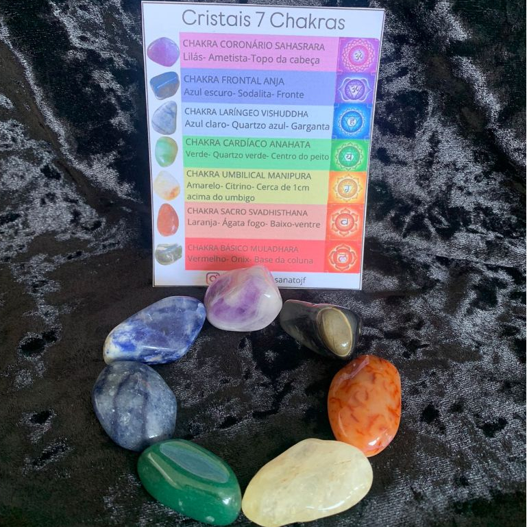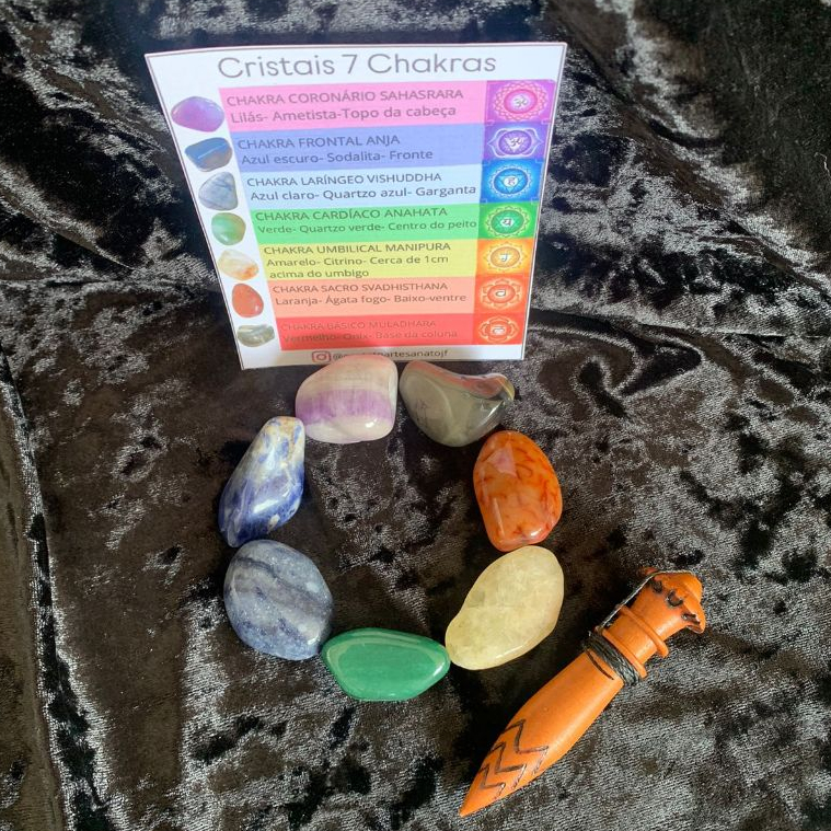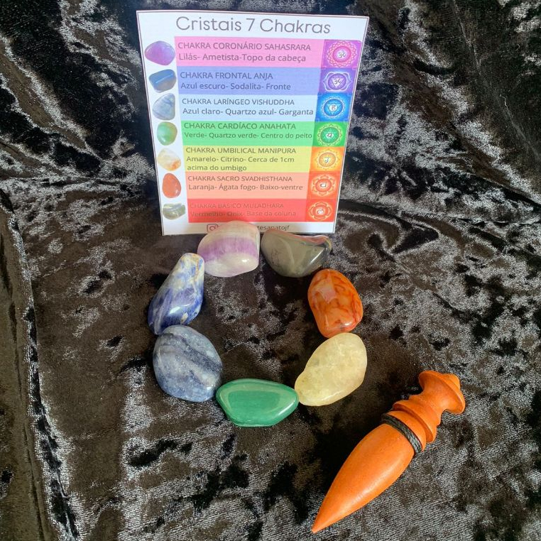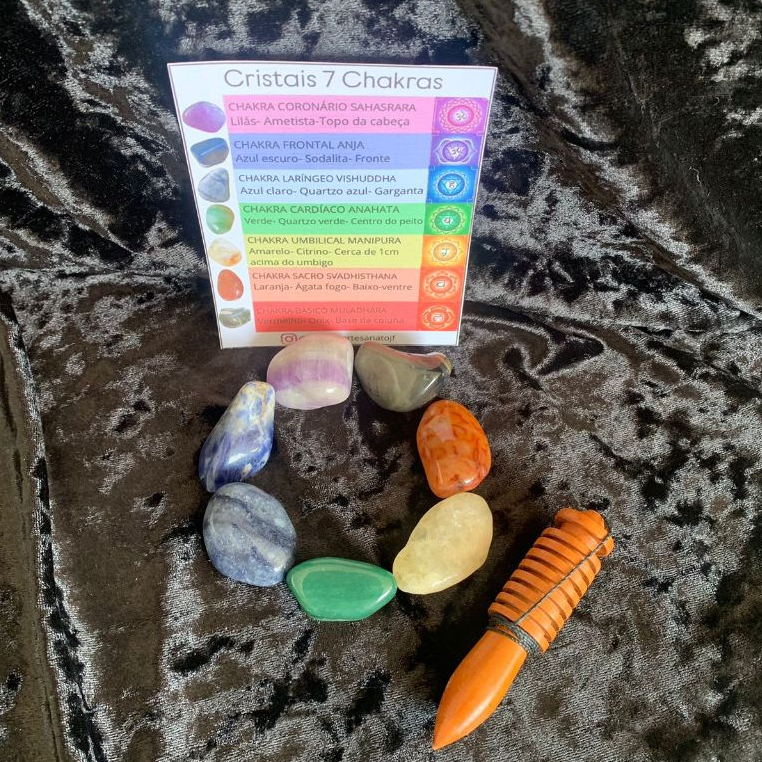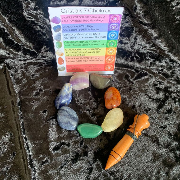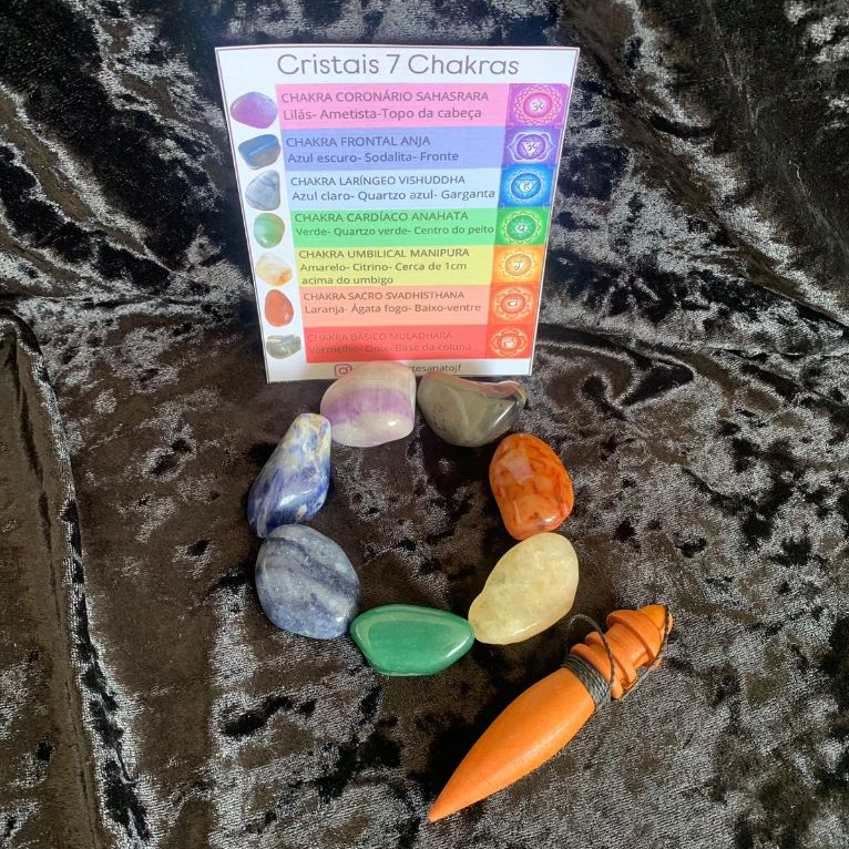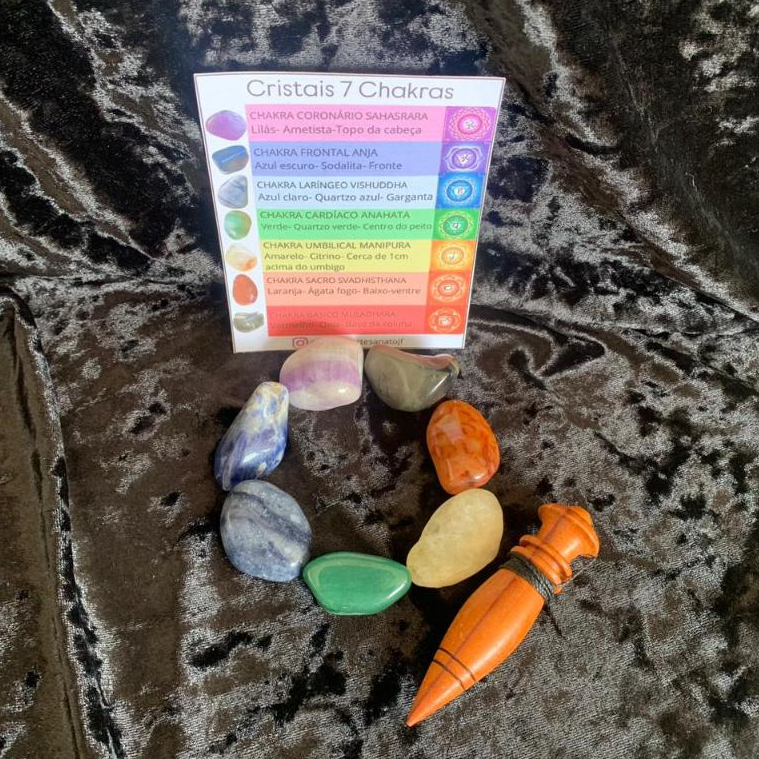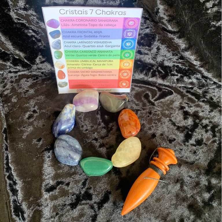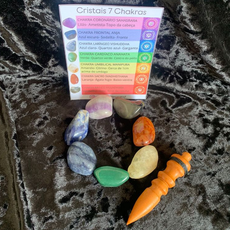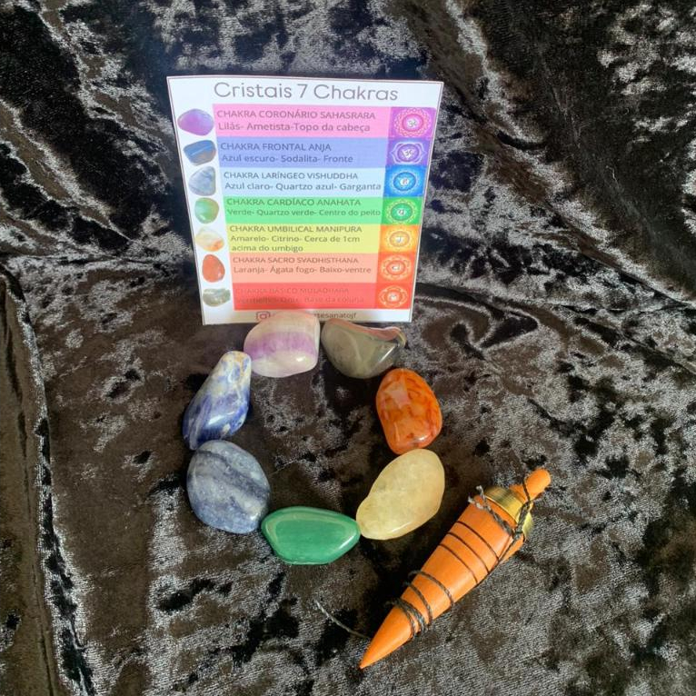 KIT 7 CRISTAIS CHAKRAS E PENDULO DE MADEIRA COM CHUMBO