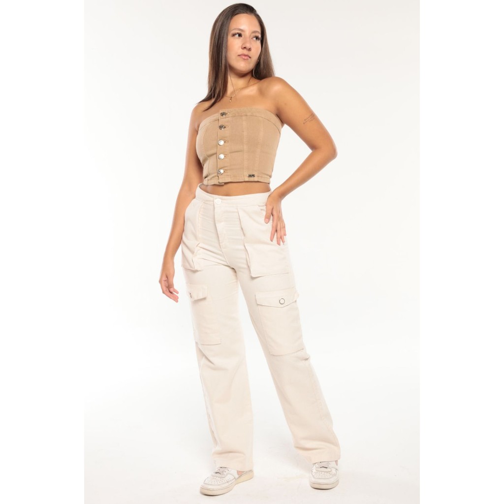 Cropped Feminino em Sarja Sem Mangas Planet Girls Bege Médio