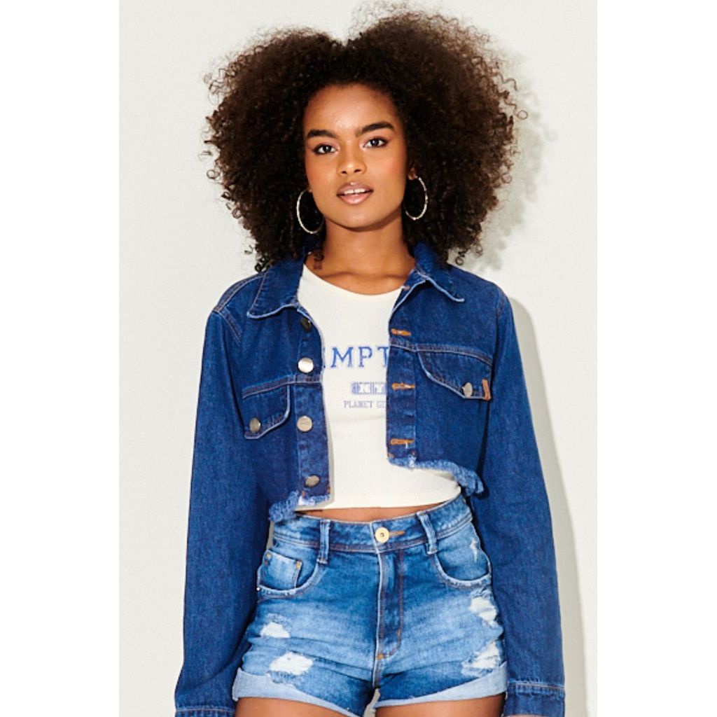 Jaqueta Cropped Feminina Barra Desfiada Planet Girls Jeans Escuro