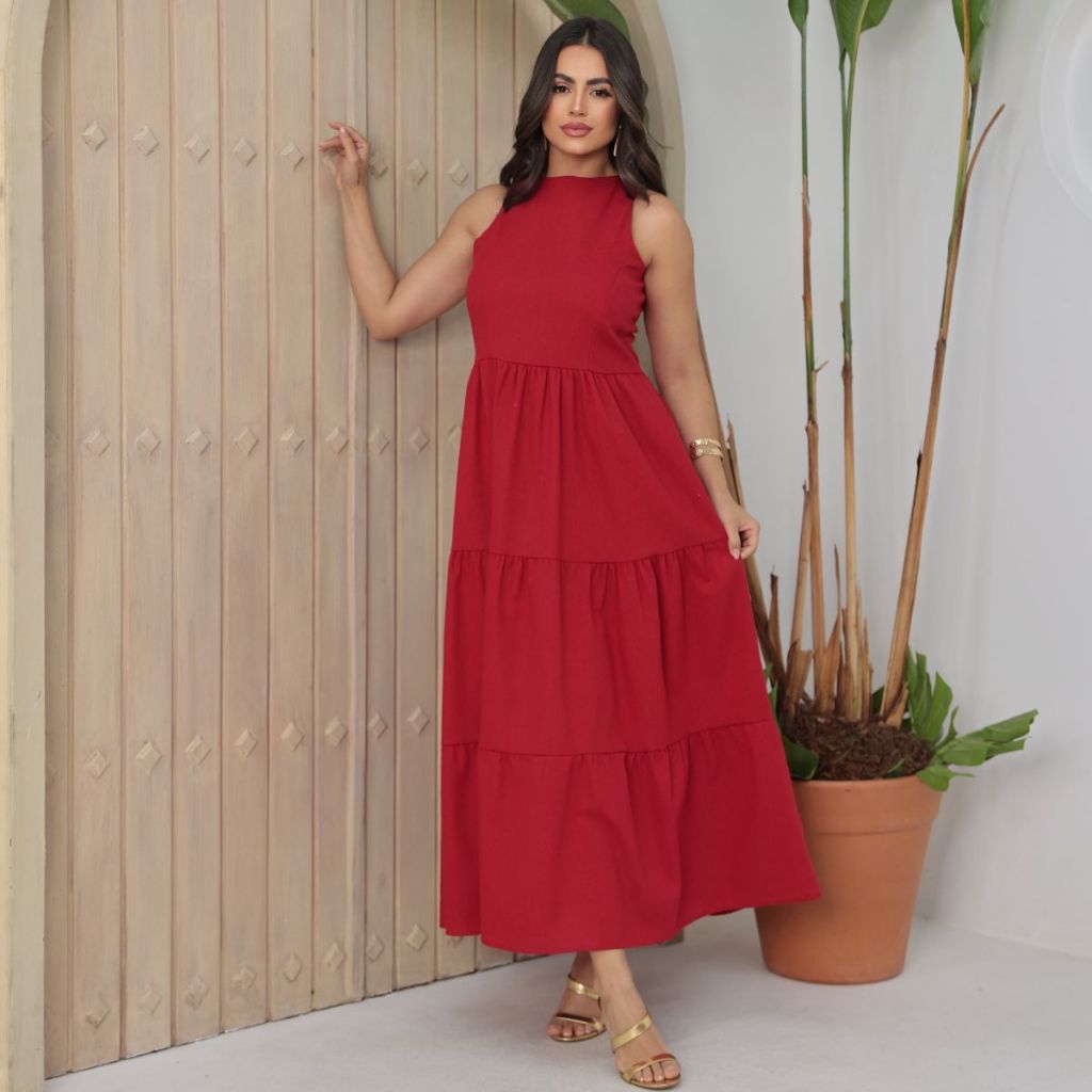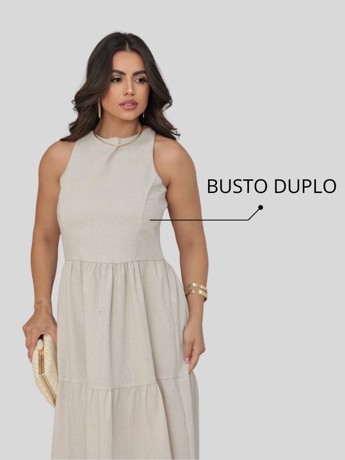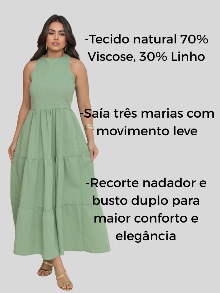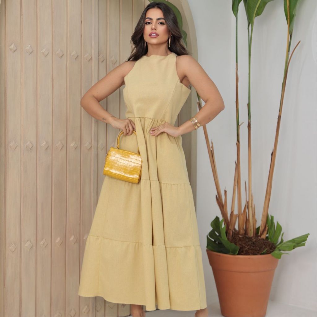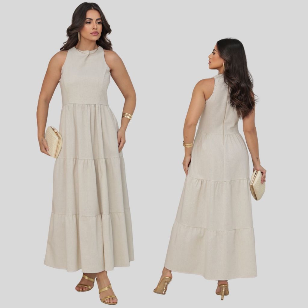 Vestido Feminino Sem Manga Midi Elegante Soltinho Casual Festa Linho Premium