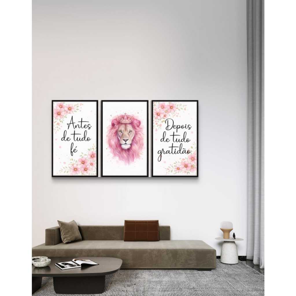 Kit 3 Peças Quadros Decorativos Leão Rosa Fé Gratidão Quarto Lindo