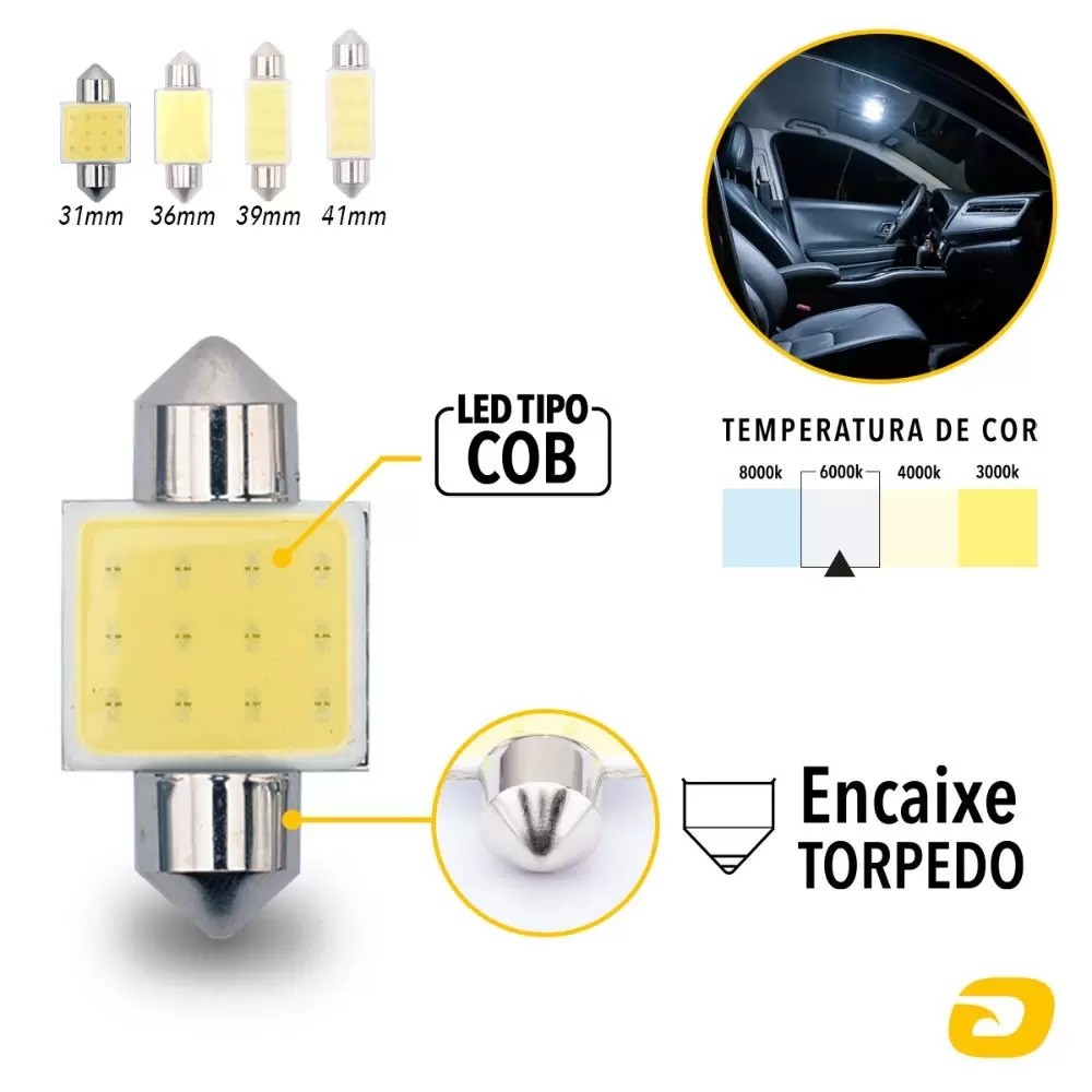 Par Lâmpada Led Cob Interior Carro Torpedo 31 36 39 41 mm 12V 6000K