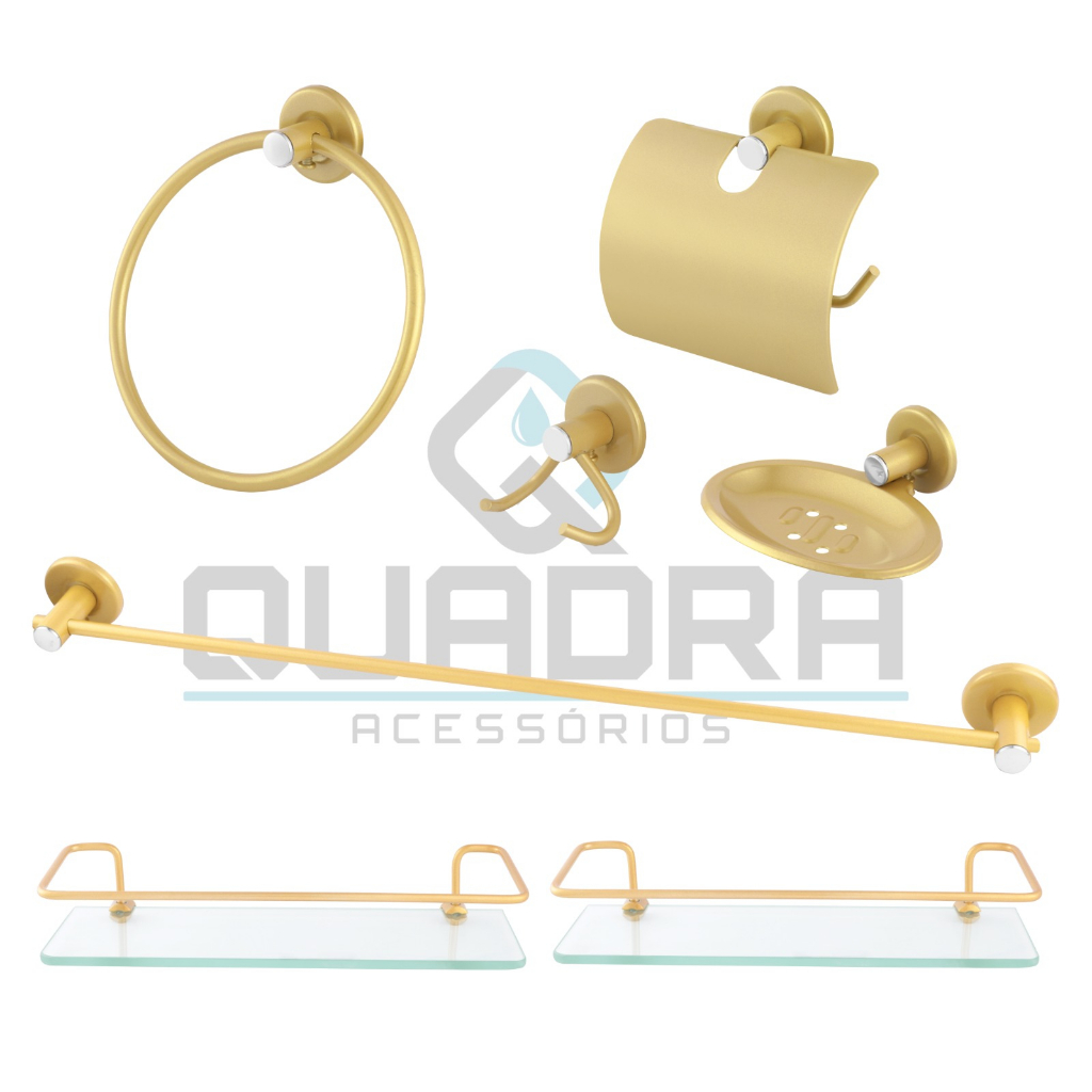 Kit para Banheiro 5 Peças Stander Dourado + 2 Porta Shampoo Reto