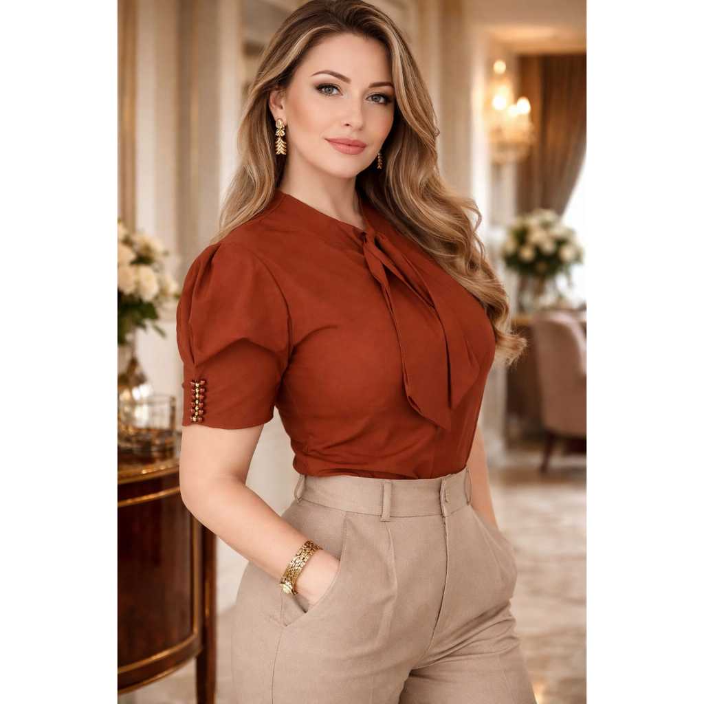 Blusa Social Feminina Laço Frontal Manga Princesa Roupa Elegante