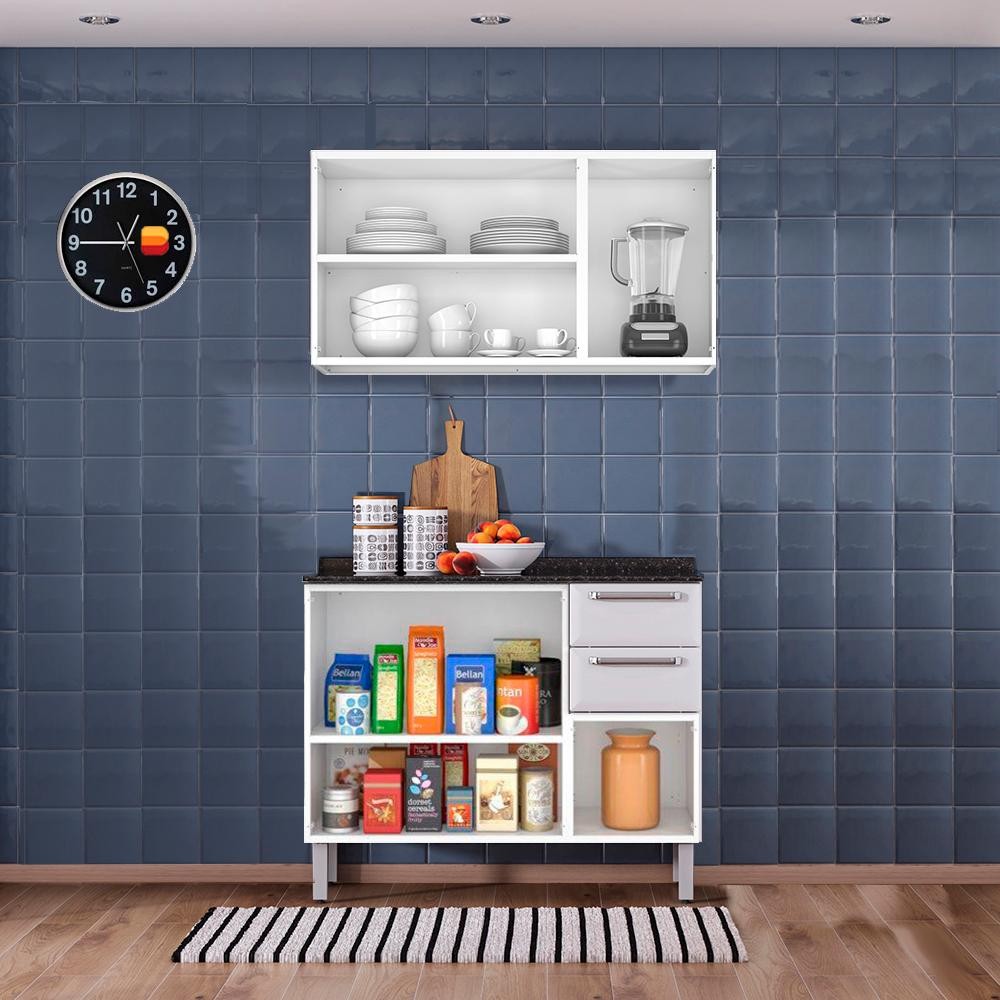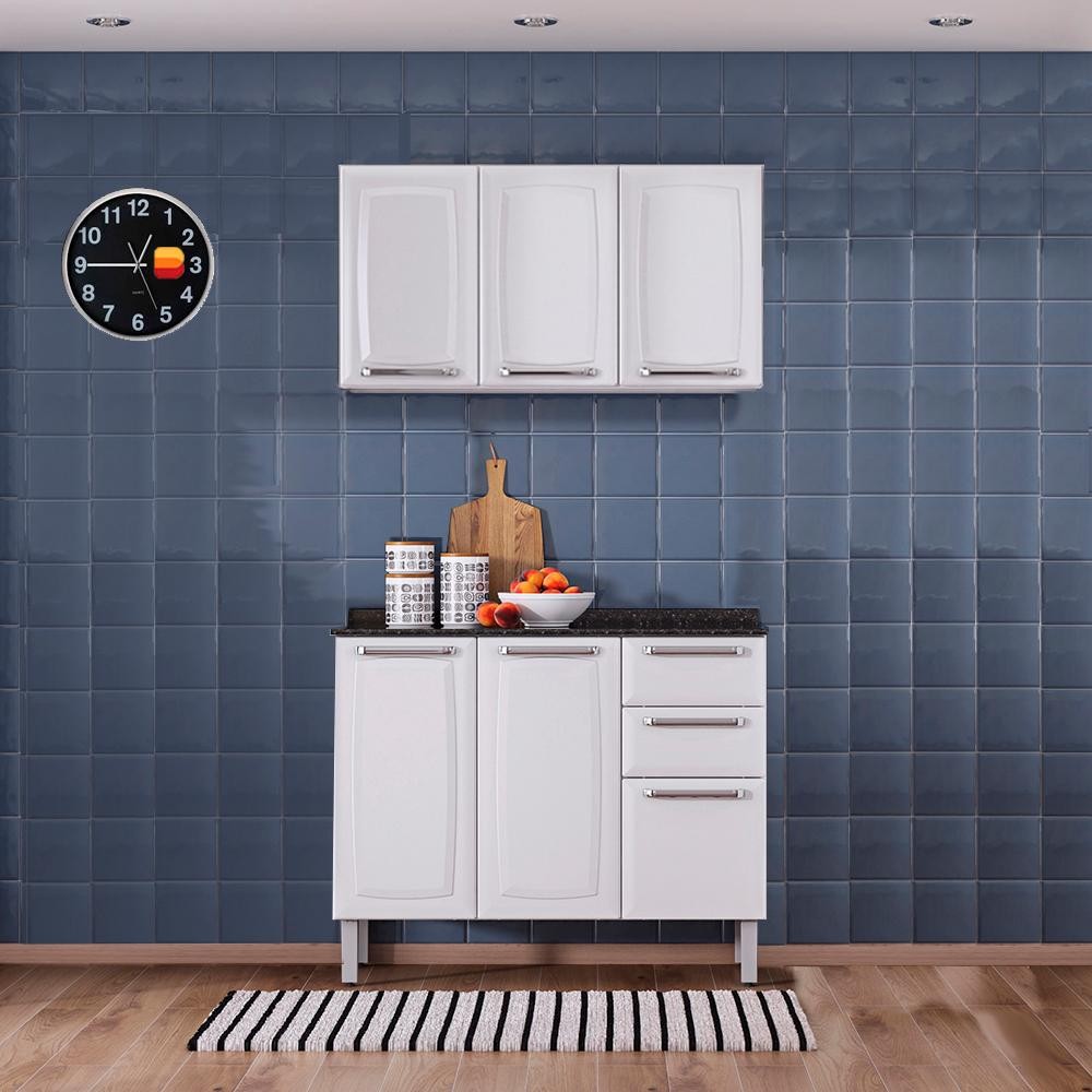 Kit Balcão 3 Portas 2 Gavetas Branco com Armário Aéreo 3 Portas Branco Itatiaia Luce