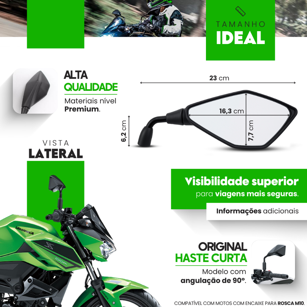 Retrovisor Modelo Z400 Rosca Honda Fixo Haste Curta Esportivo Kawasaki Lente Convexa