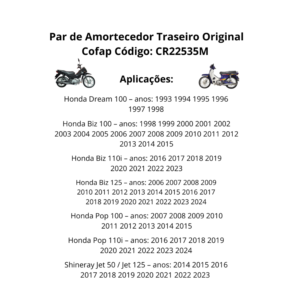 Par Amortecedor Suspensão Traseira Honda Biz 125 Biz 110i Dream 100 Shineray Jet 50 Pop 100 Cofap