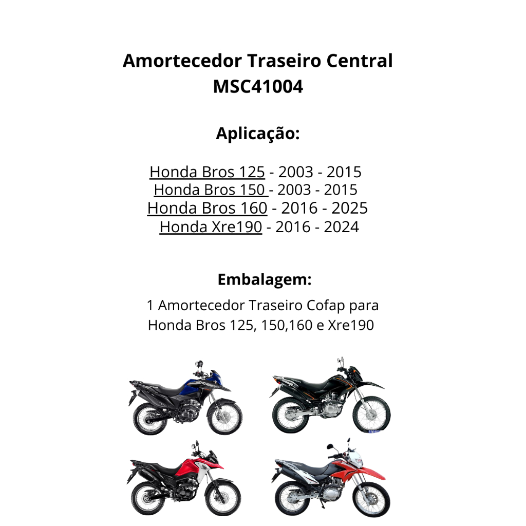 Amortecedor Suspensão Traseiro Central NXR Bros 125 150 160 Xre 190 de 2004 até 2025 Original Cofap