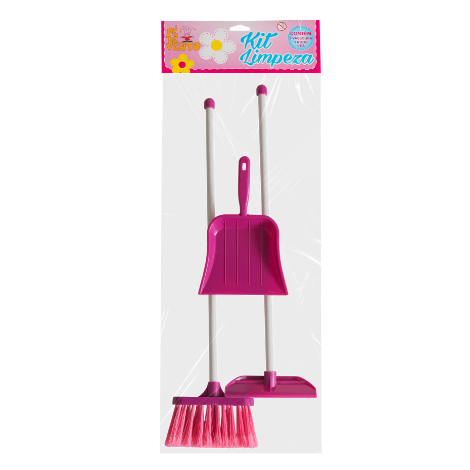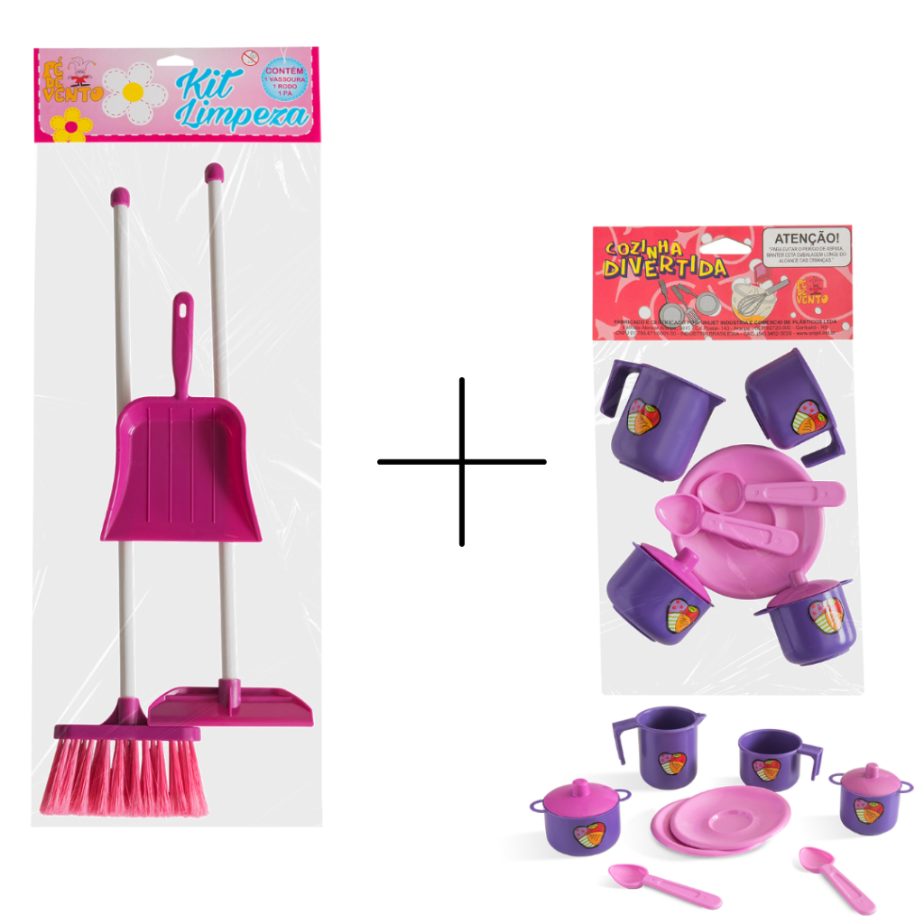 Brinquedo Infantil Menina Vassoura Rodo Pá + Kit Cozinha Infantil Panelinha de Brinquedo Cor Rosa