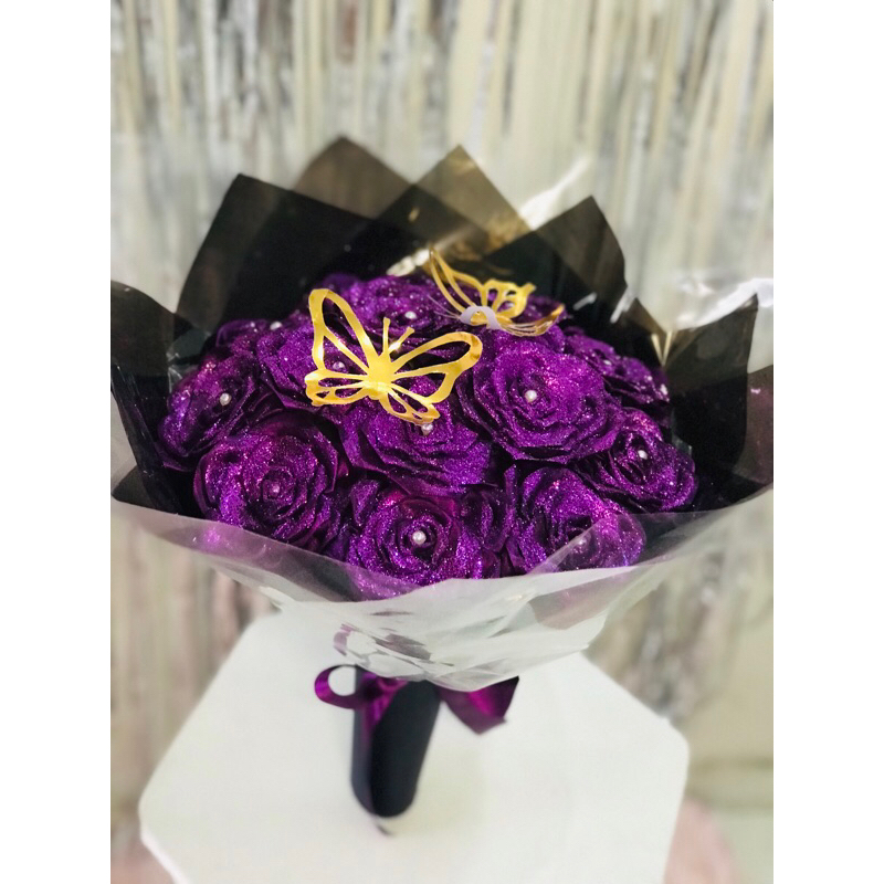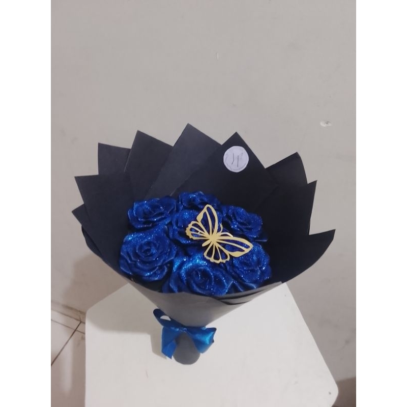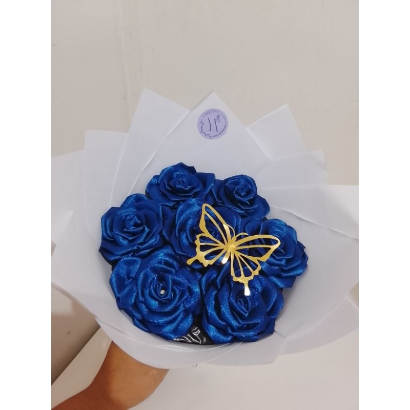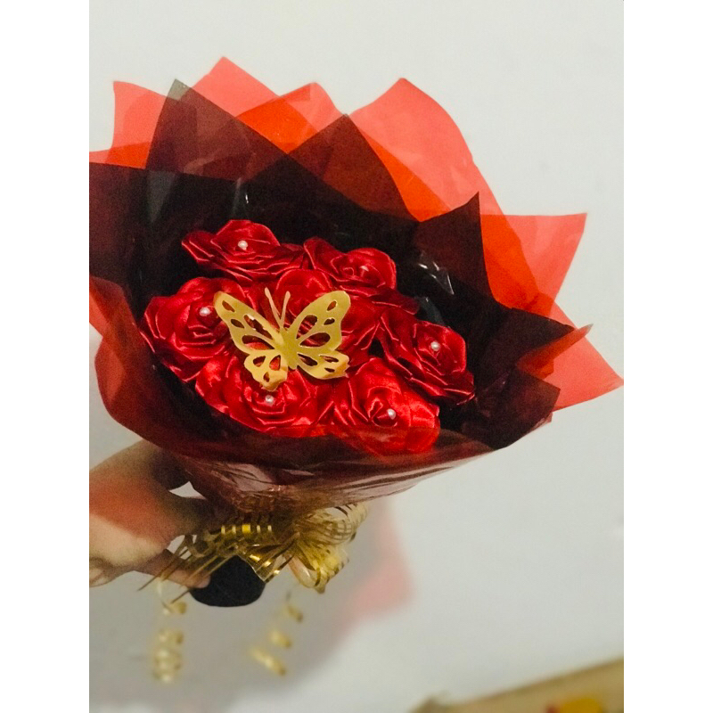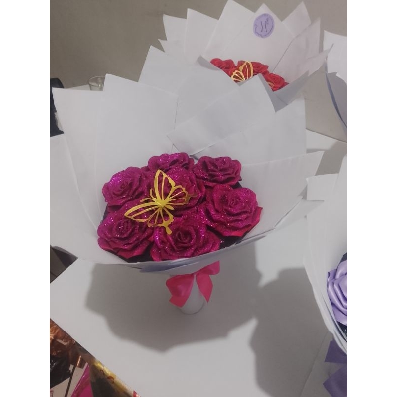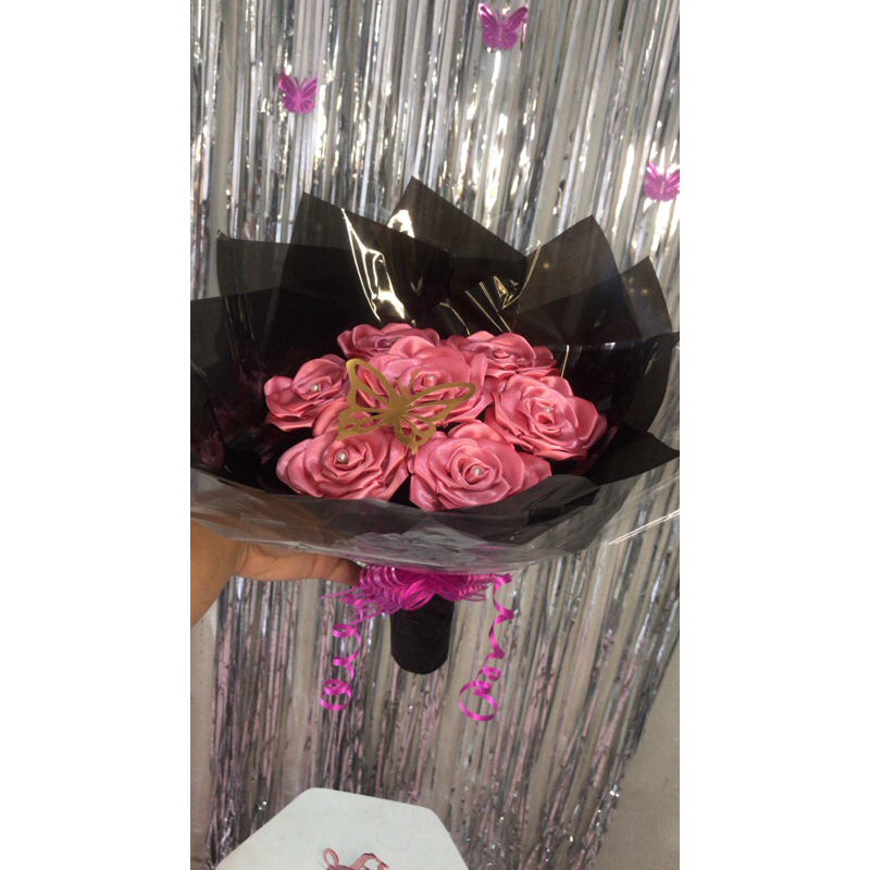 Buquê de flores com 7 rosas (montado)com borboleta metalizada.