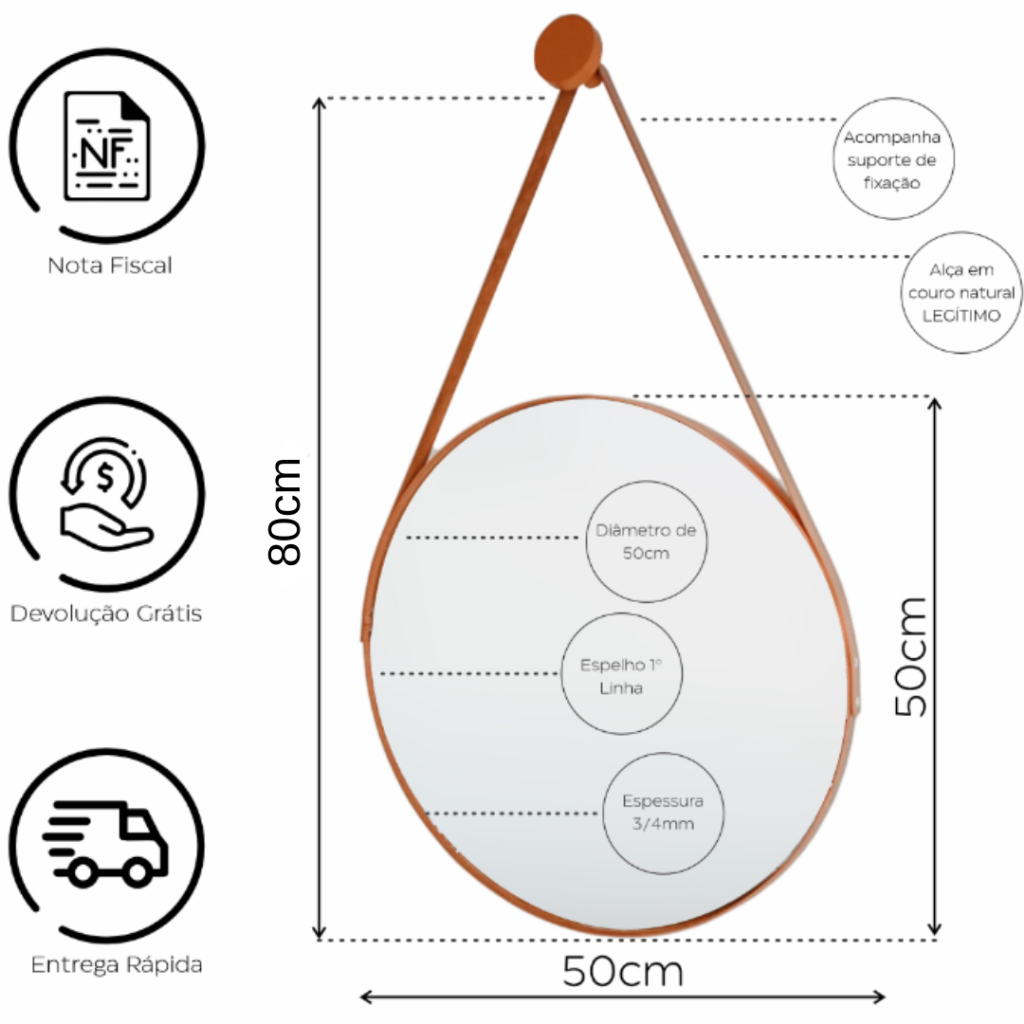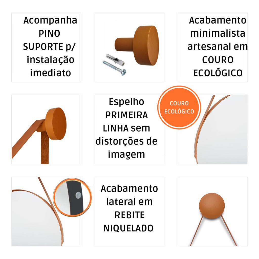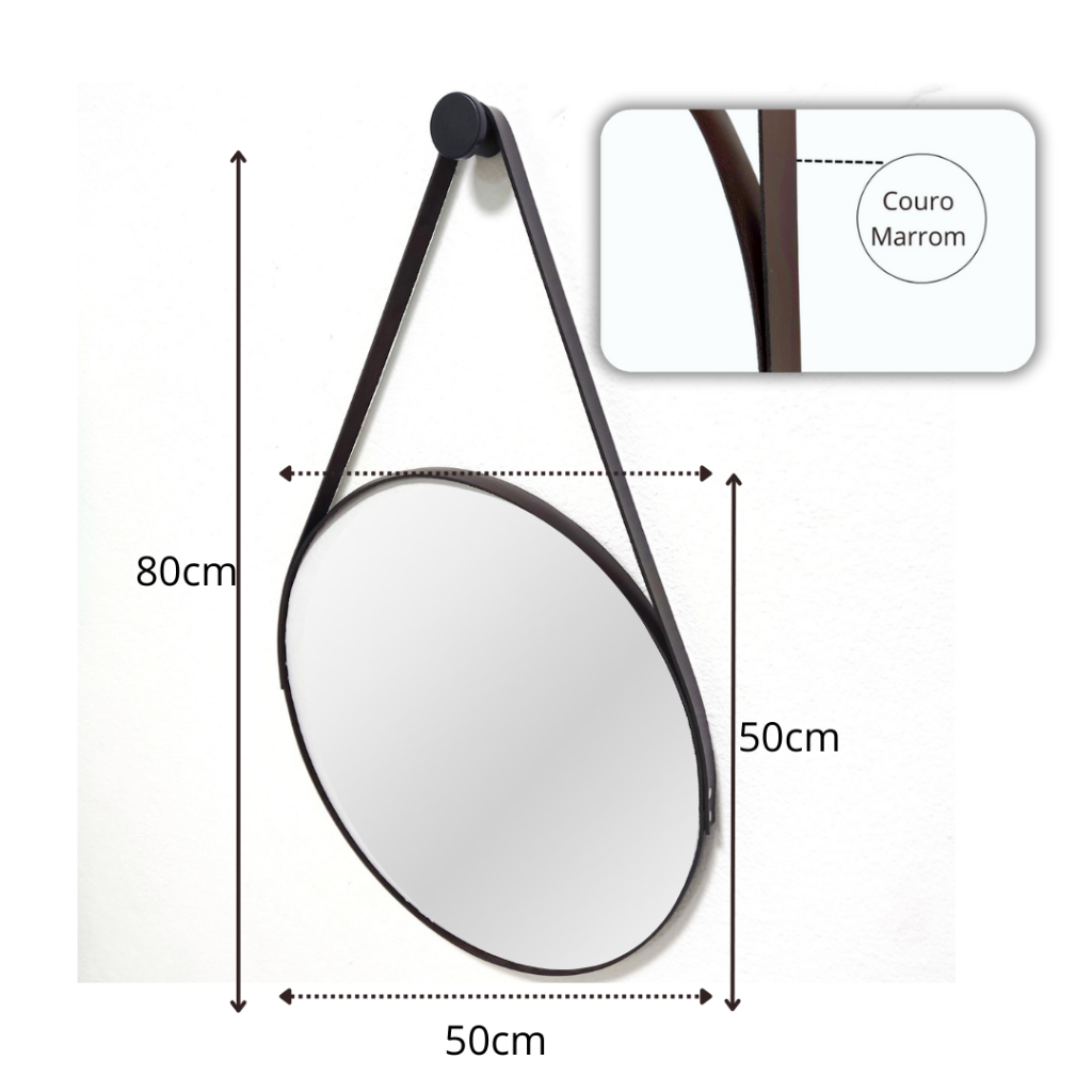 Espelho Decorativo Suspenso 50cm Alça de Couro Imagem Nítida