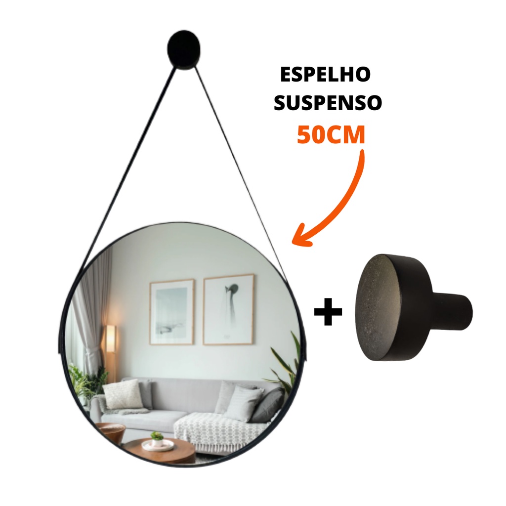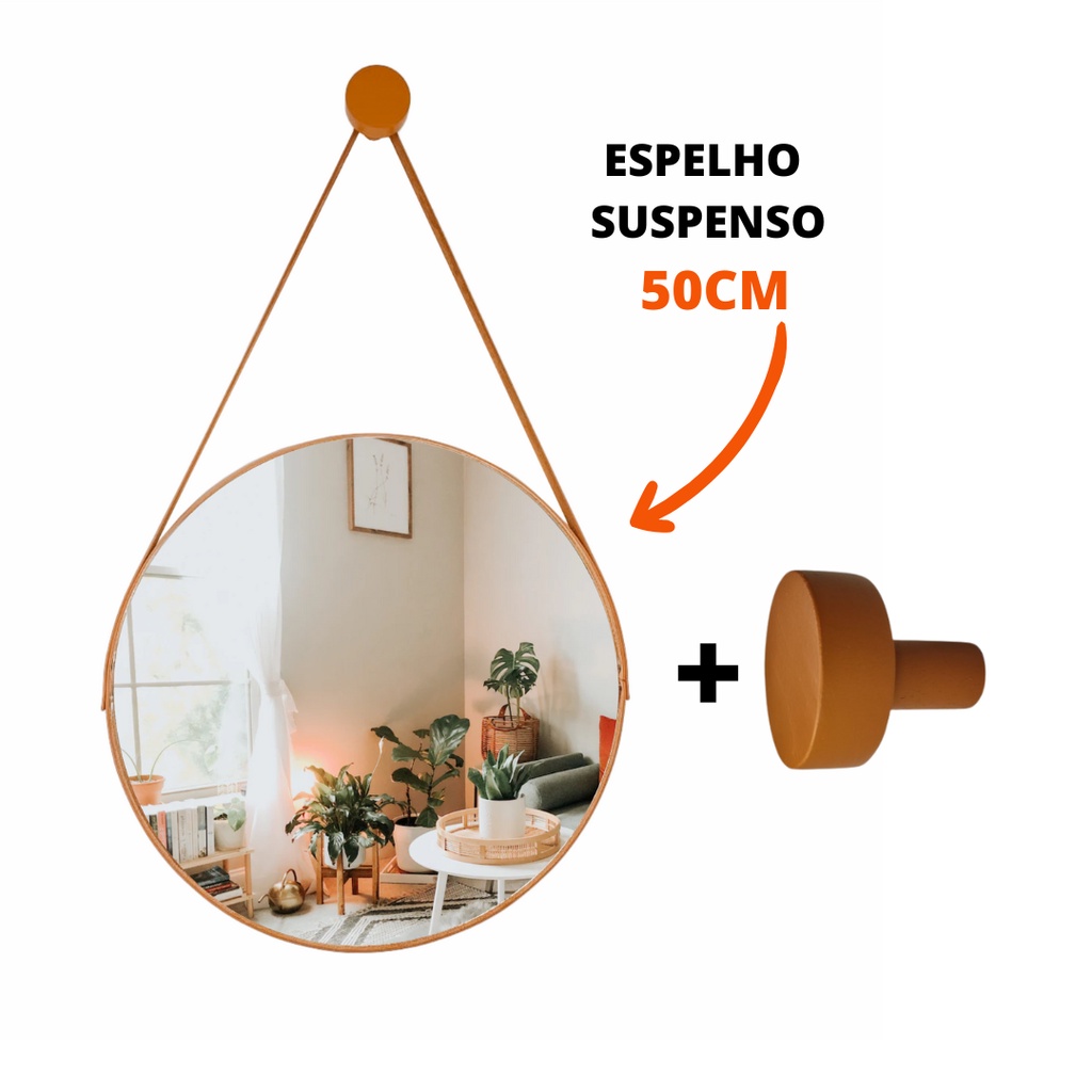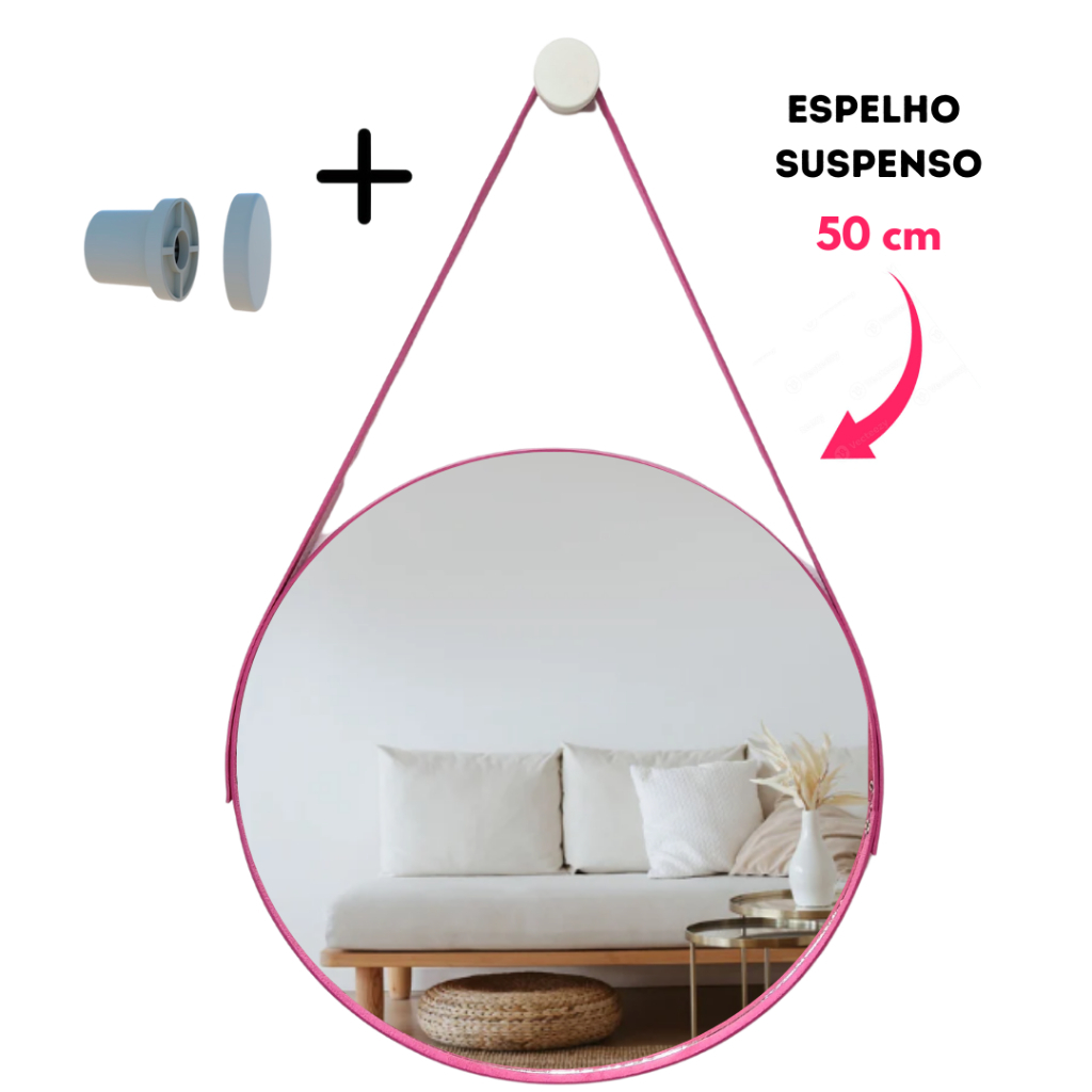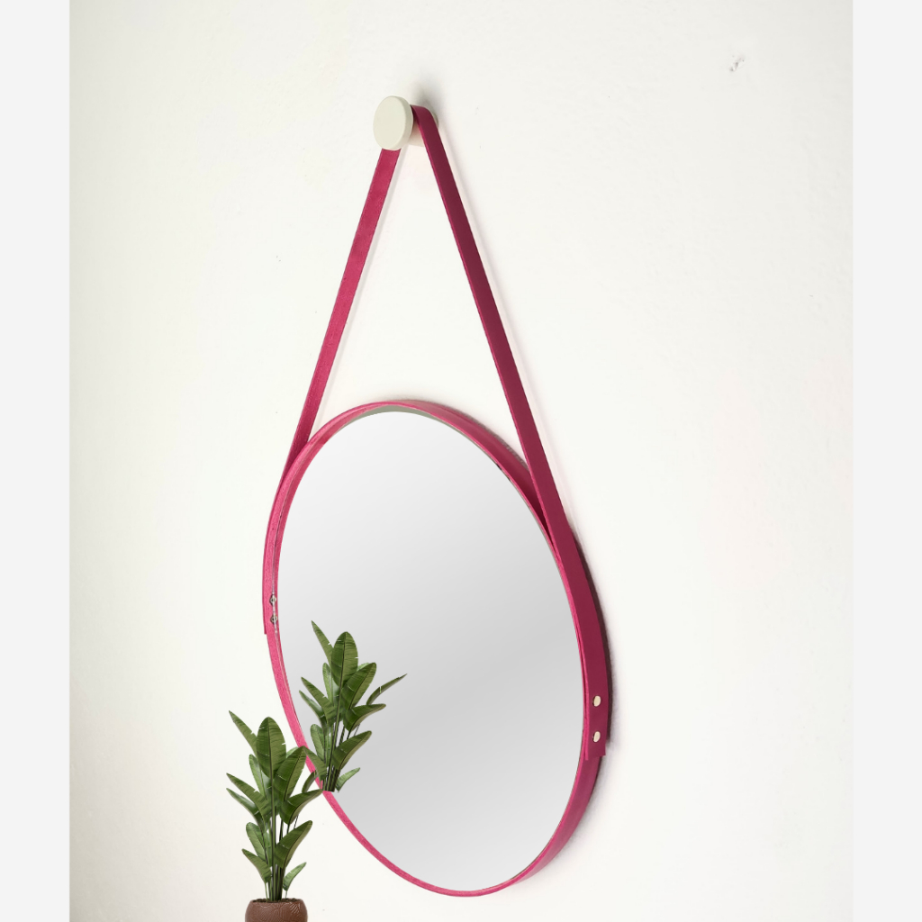 Espelho Decorativo Suspenso 50cm Alça de Couro Imagem Nítida
