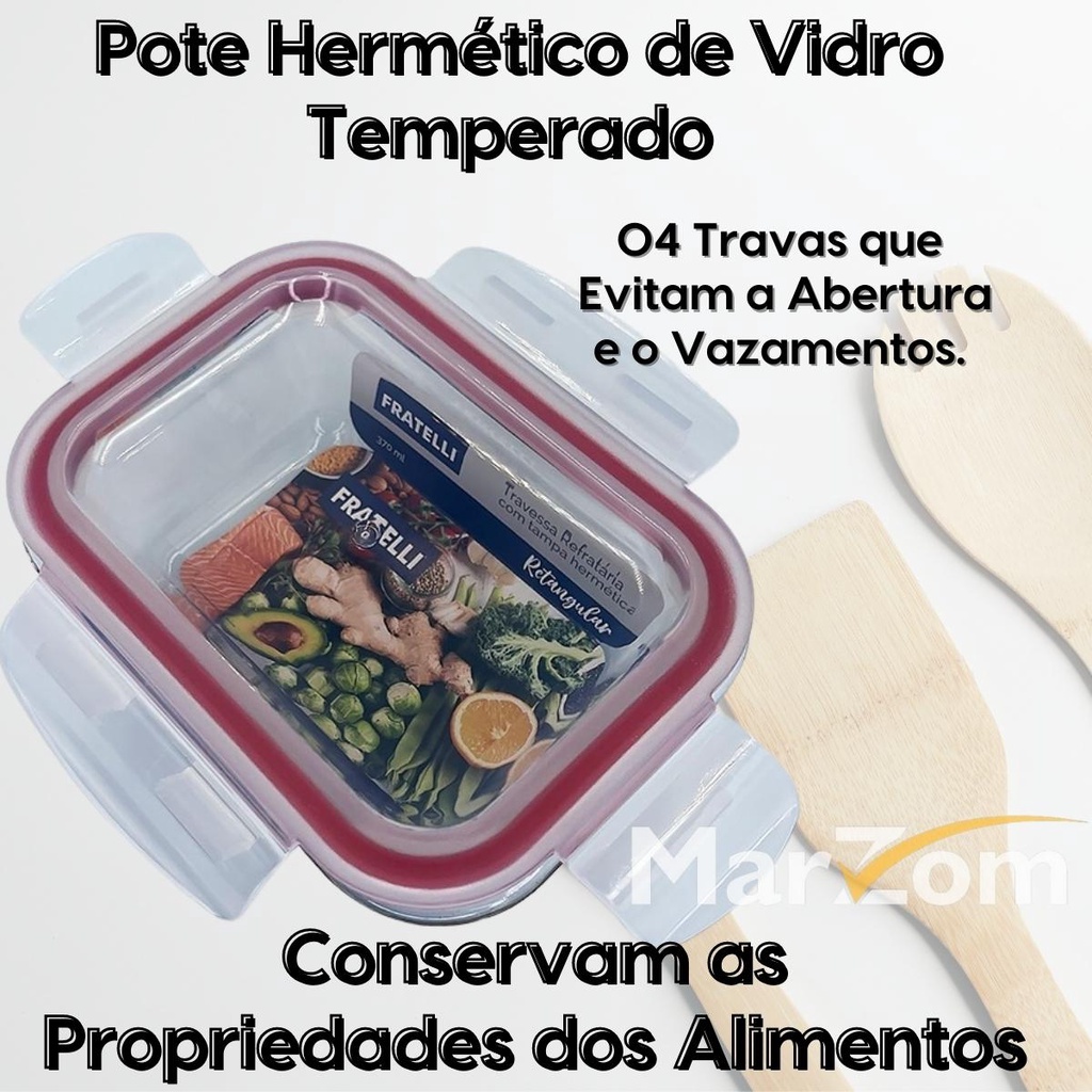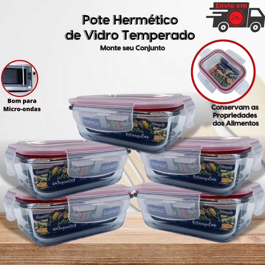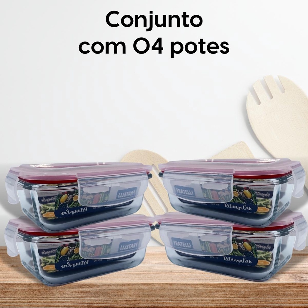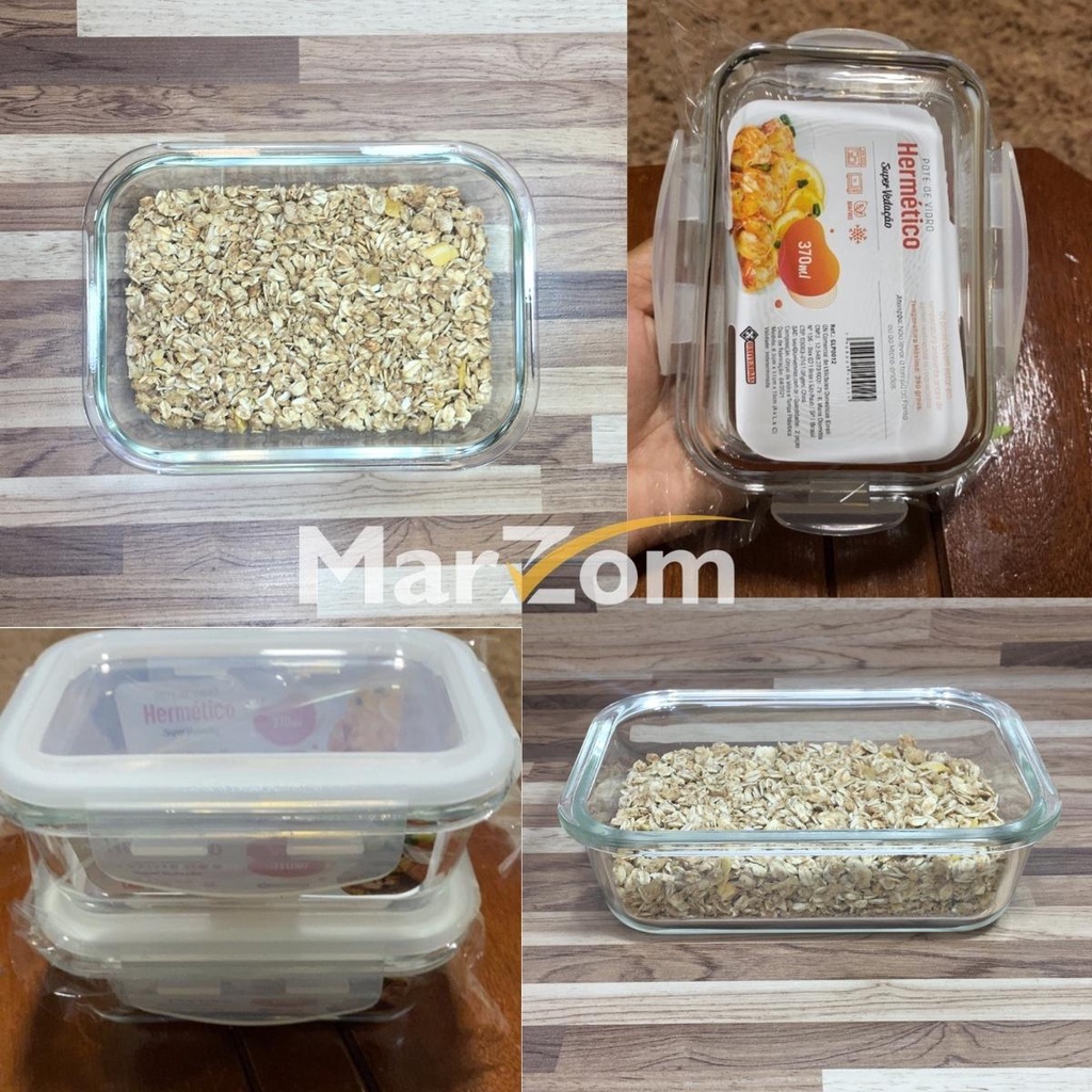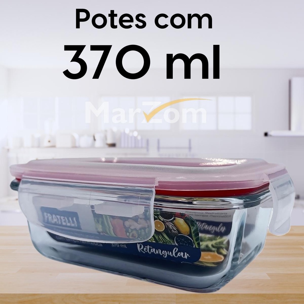 Pote de Vidro Hermético Marmita Tampa Plástico com Trava 370ml - Conjunto 2 ou 4 Potes Vidro Marmita Fit 4 Travas para Microondas Forno e Freezer Promoção - Tapoer de Vidro com Tampa - Potes de Vidro para Mantimentos