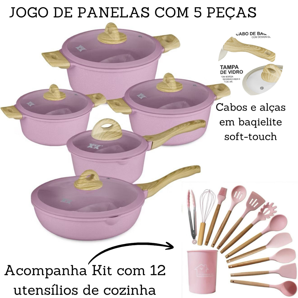 Jogo De Panelas 5 Peças Antiaderente Indução Gás Conjunto Revestido Cerâmica + Kit Utensílios De Cozinha 12 Peças