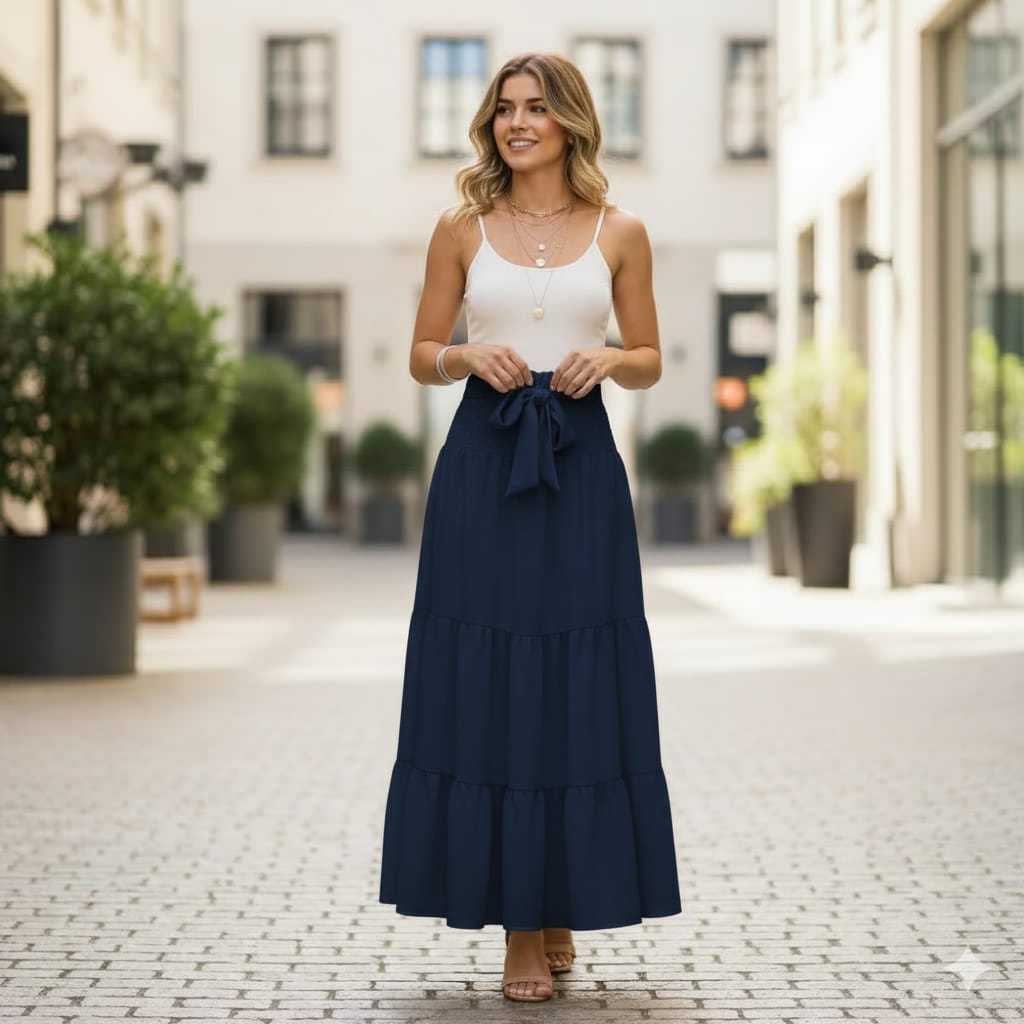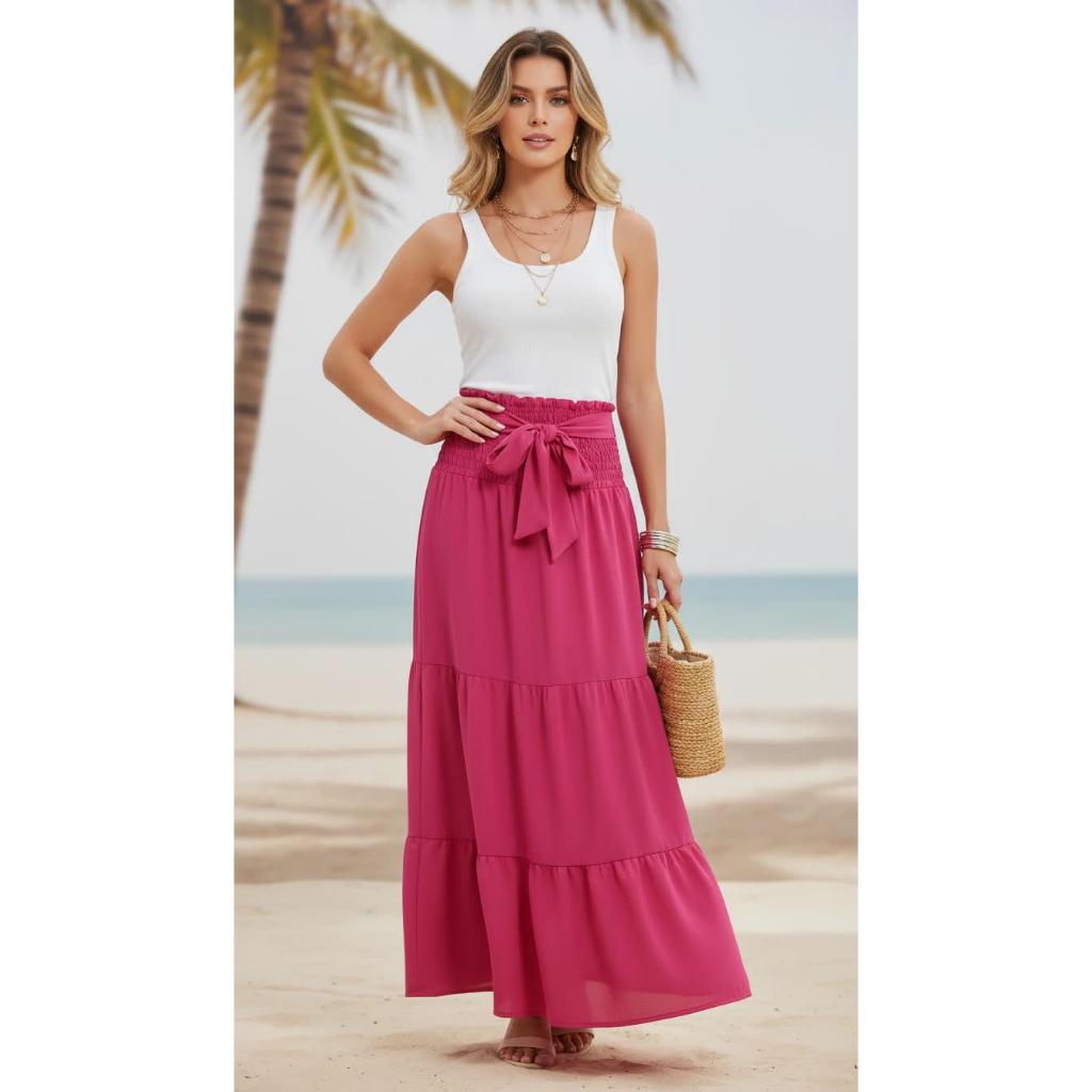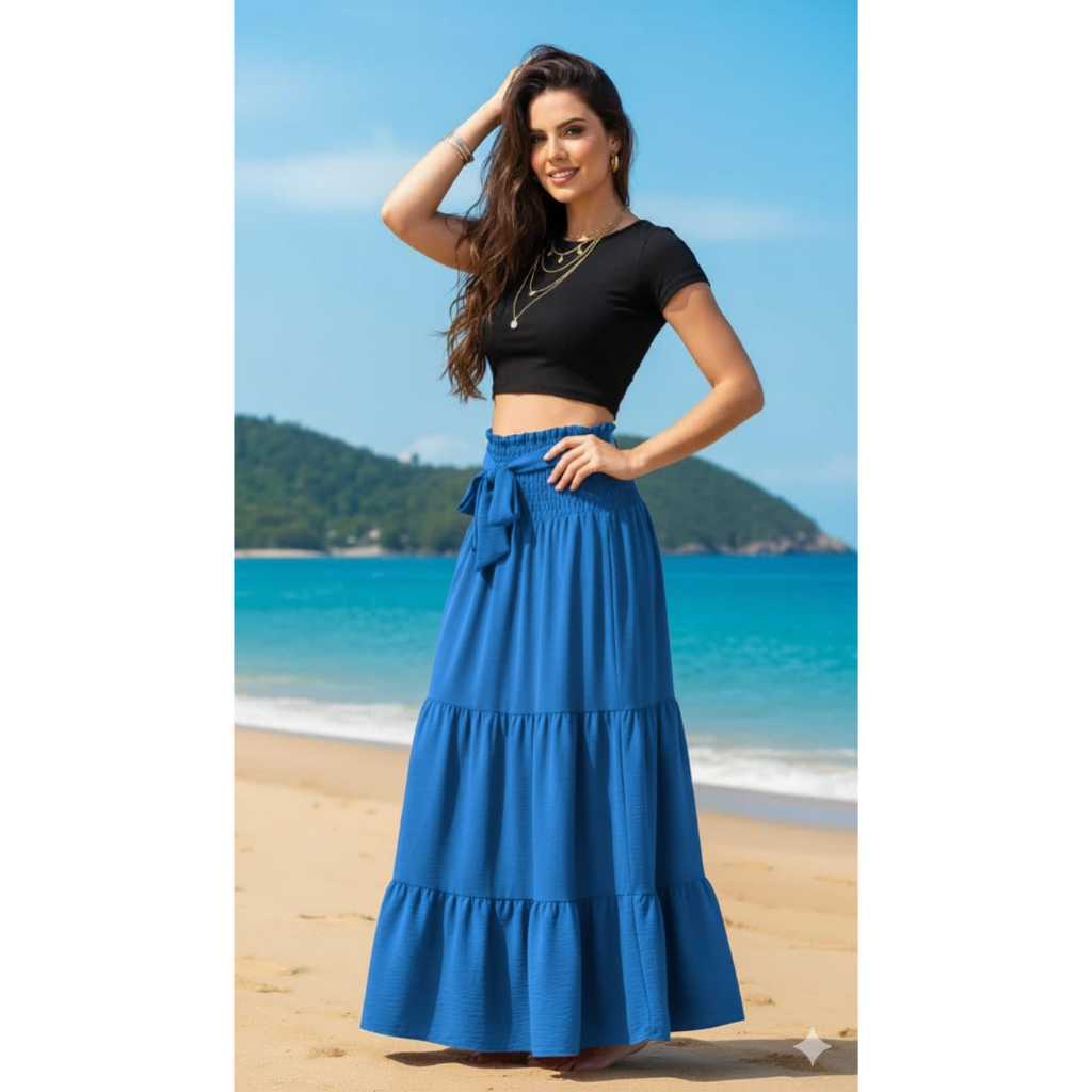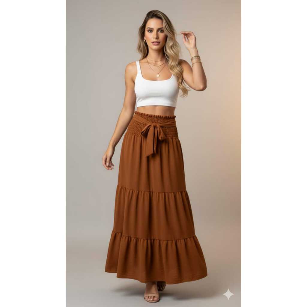 Saia Longa Feminina Três Maria Cintura Alta Com Laço Fit e Flare Moda Evangélicas 2026