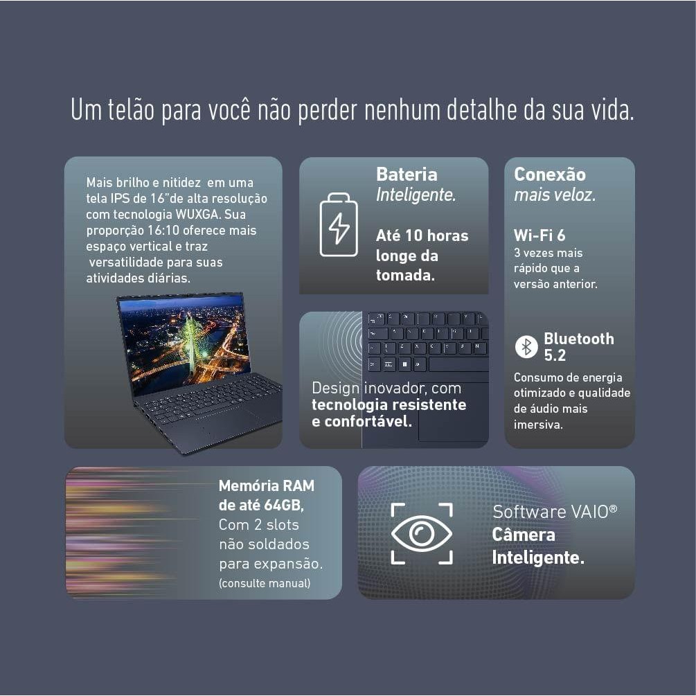 Notebook VAIO FE16 AMD® Ryzen 5-5625U Linux 8GB RAM 256GB SSD 16" IPS WUXGA Antirreflexo - Cinza