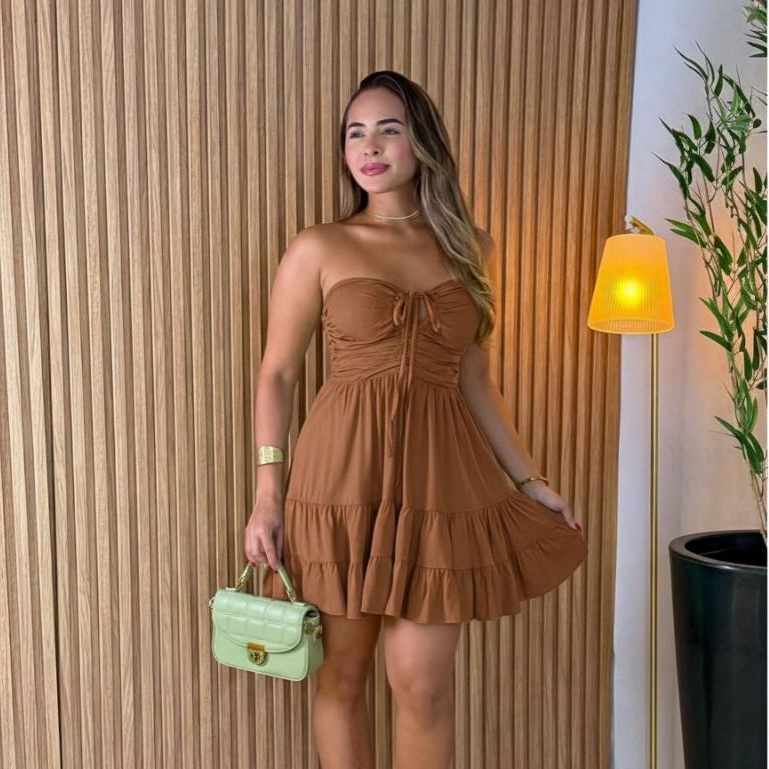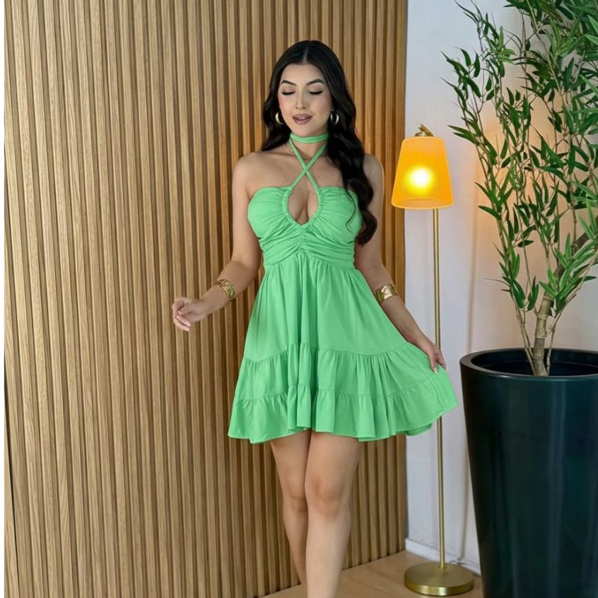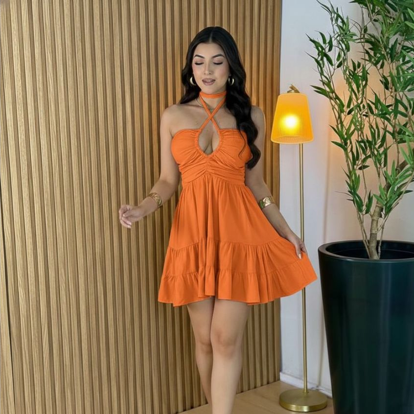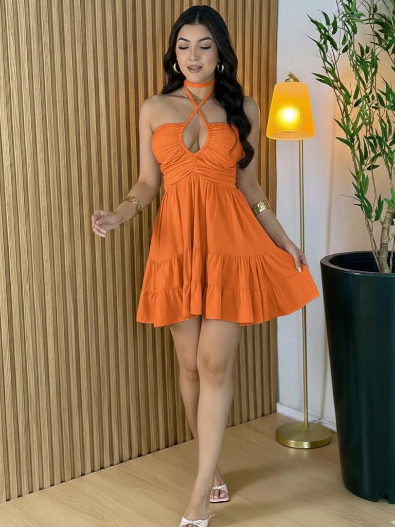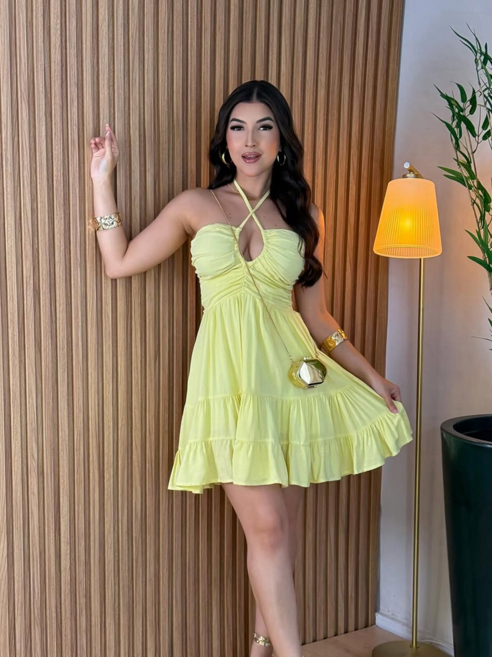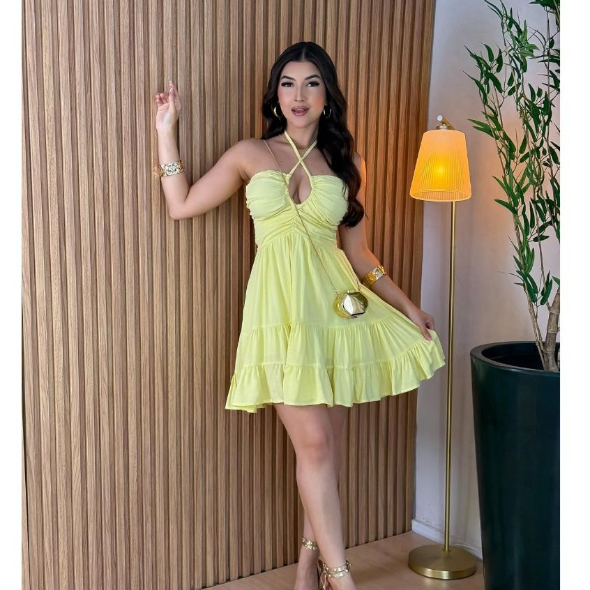 Vestido Feminino Curto Soltinho Acinturado com Babados e Amarração frontal Multiformas