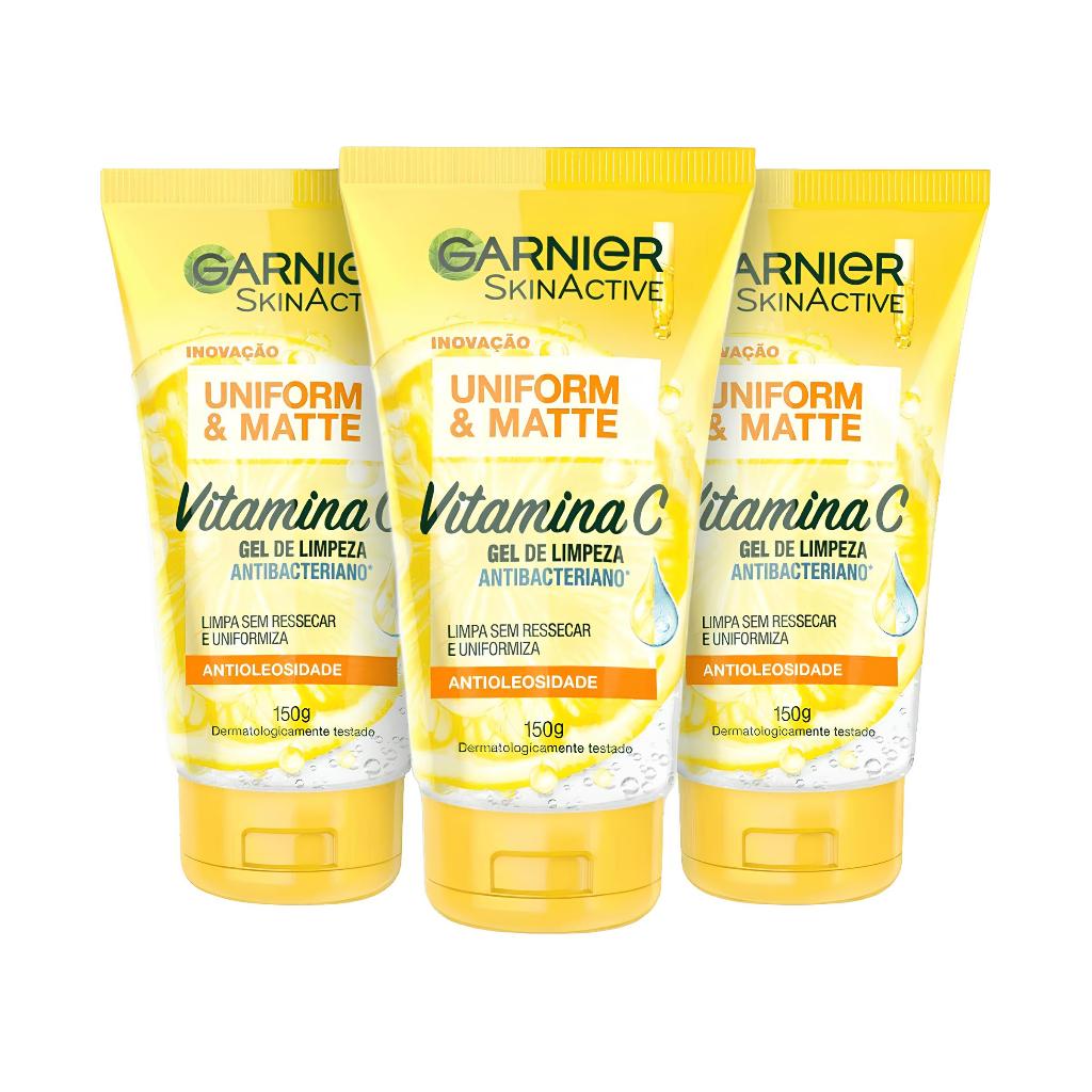 Kit 3 Gel de Limpeza Facial Antibacteriano Garnier Uniform & Matte Vitamina C, 150ml