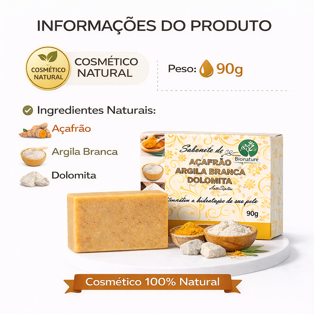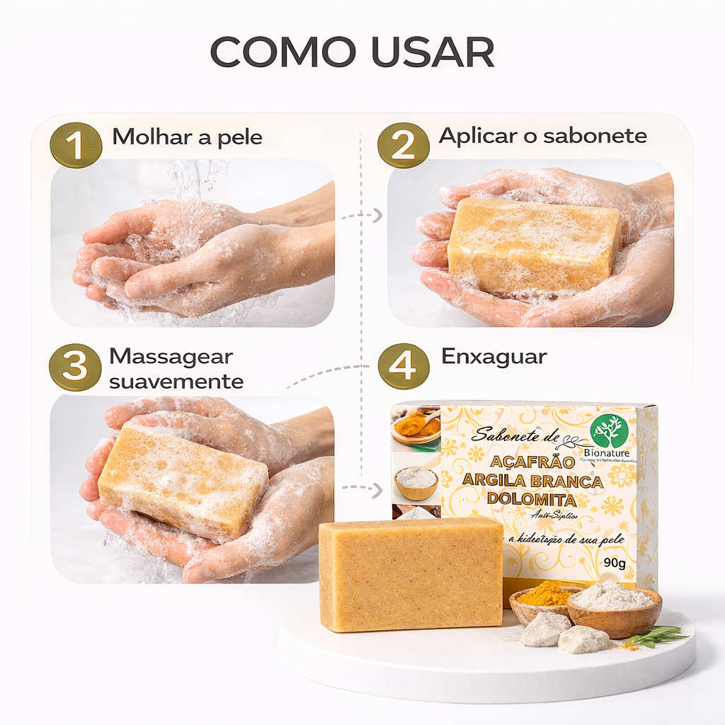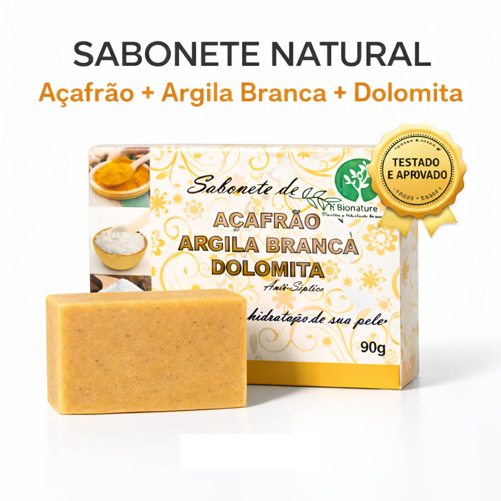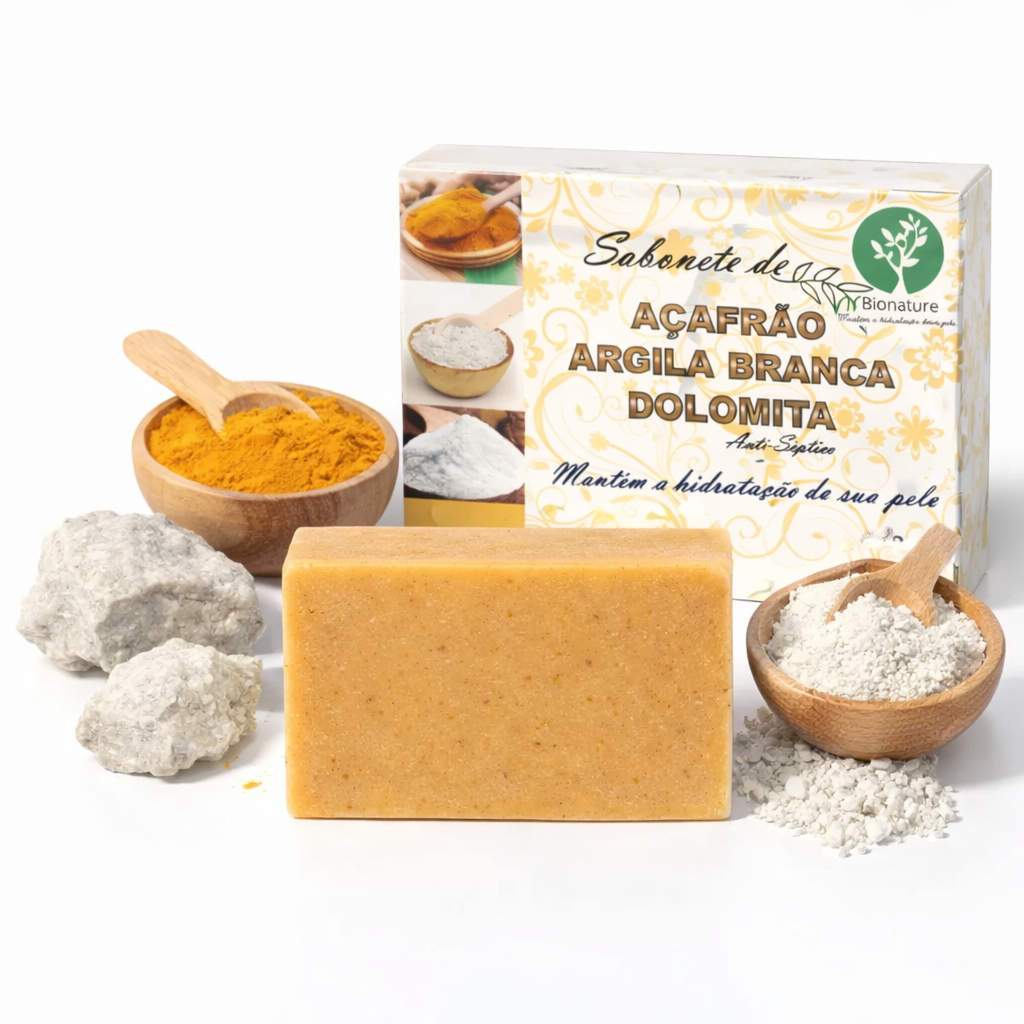 1 Sabonete de Açafrão, Argila Branca e Dolomita – Auxilia na limpeza da pele equilibra a oleosidade