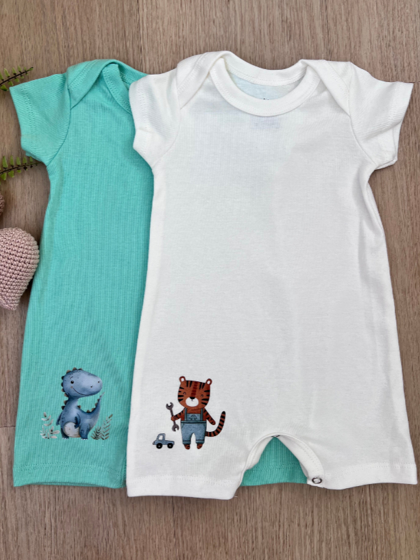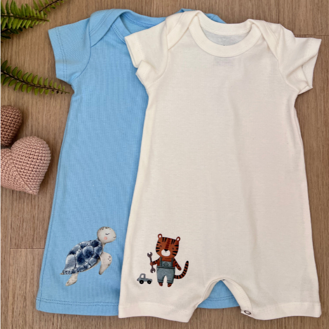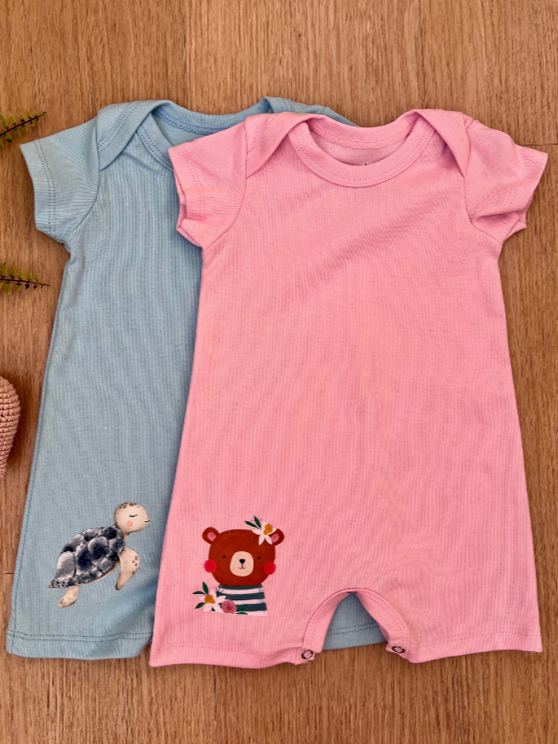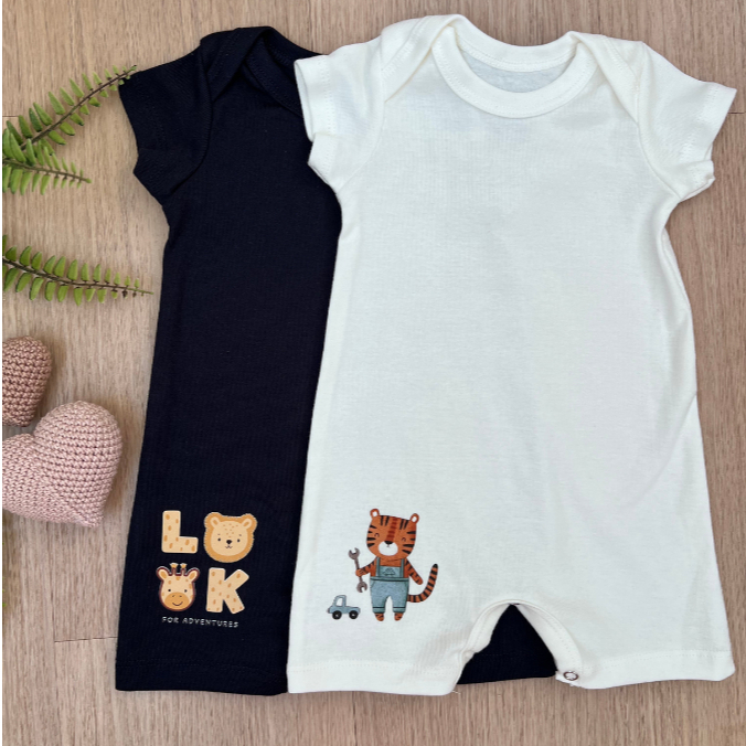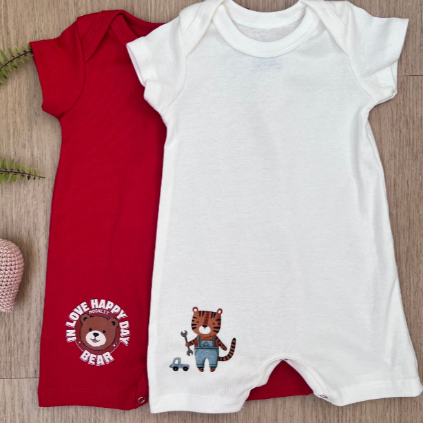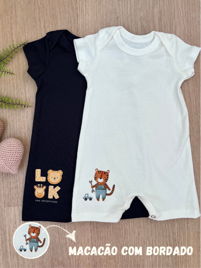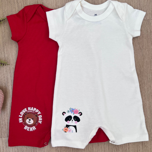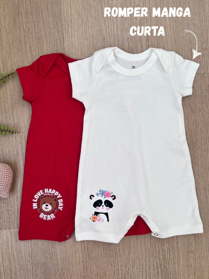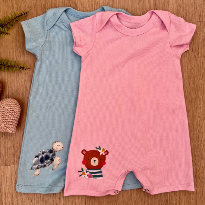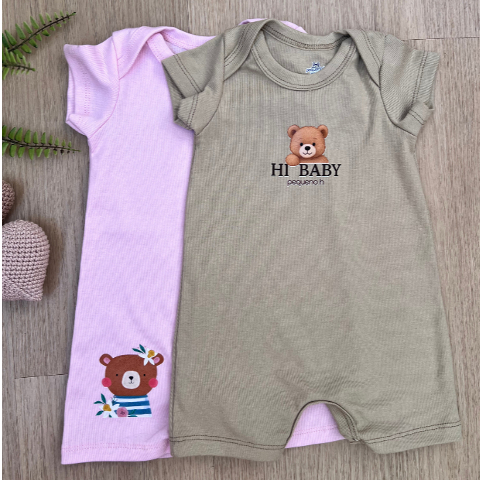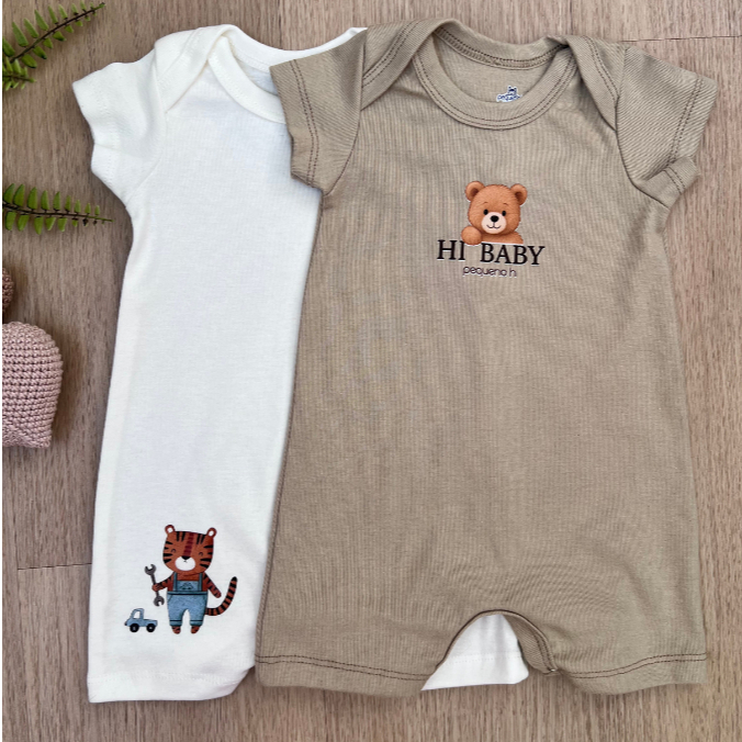 Romper Bebê Macacão Curto Infantil Kit 2 Bordado Menino Menina Manga Curta 100% Algodão