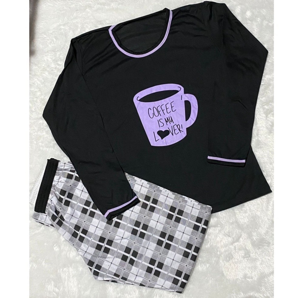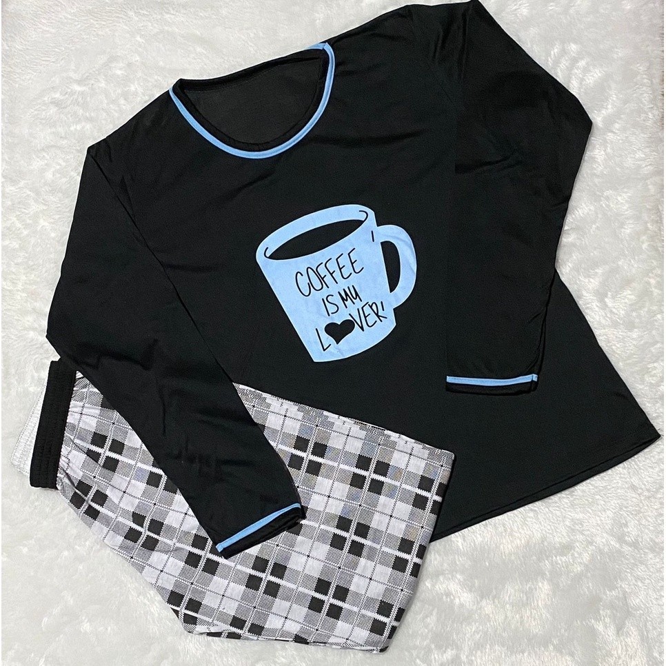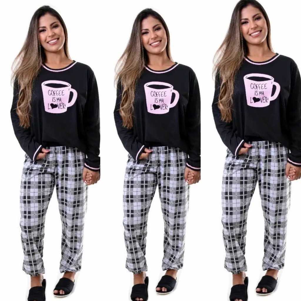 Pijama de Frio Inverno Calça Xadrez Barato Promoção de Dormir Virg Feminino Adulto Manga Comprida e Calça Longa Comprida