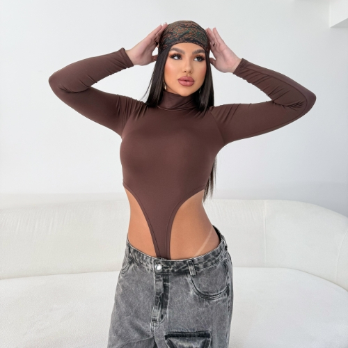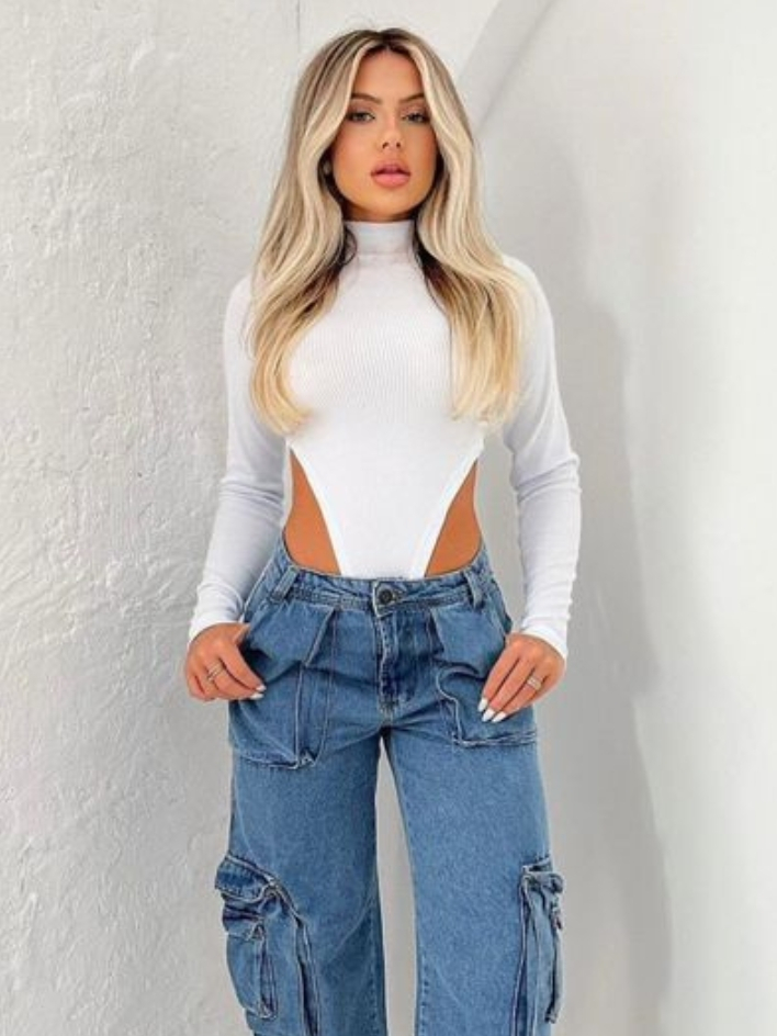 Body Collant Feminino Cavado Gola Alta Manga Longa Tendência Moda Blogueira