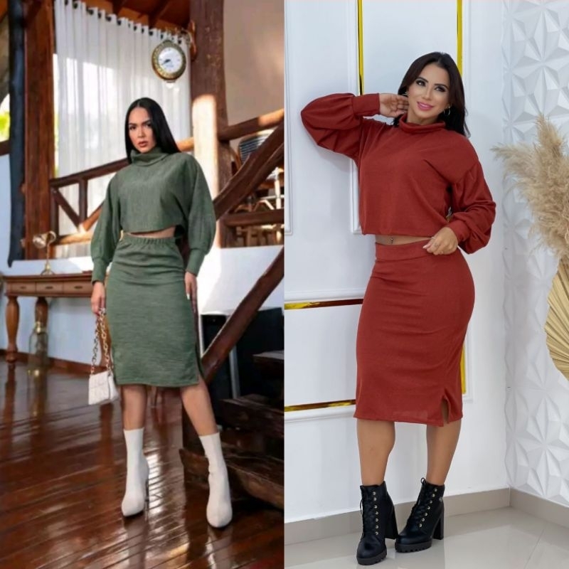 (ref.42)Conjunto feminino outono inverno saia e blusa cropedy manga bufante lanzinha
