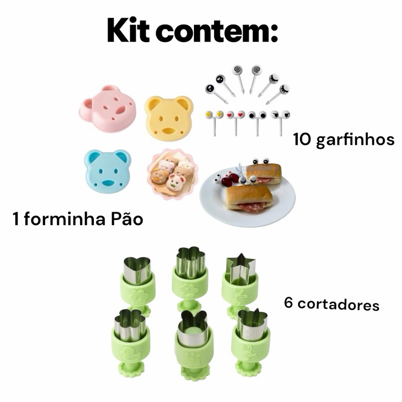 Kit 10 Garfinho + 6 Forma Molde Cortador Frutas + 1 Ursinho