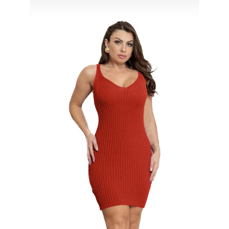 Vestido Tricot Canelado Moda Decote V Tubinho Midi Regata