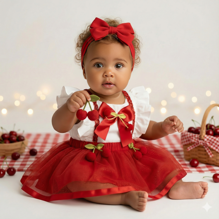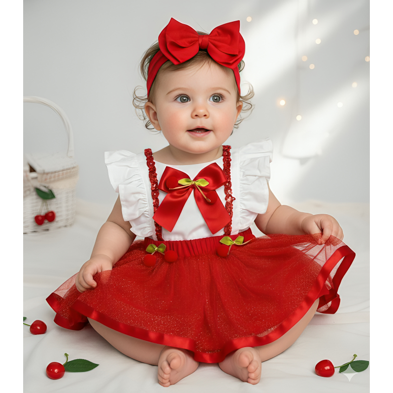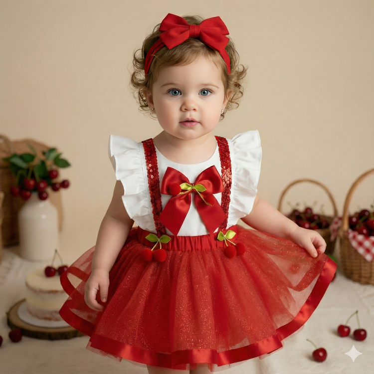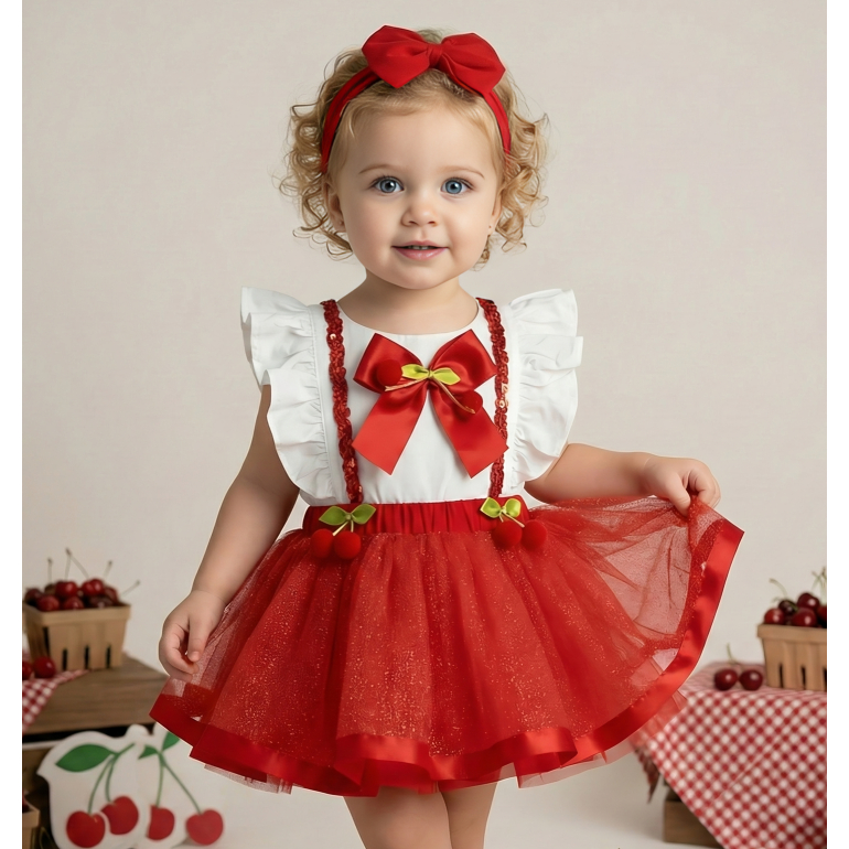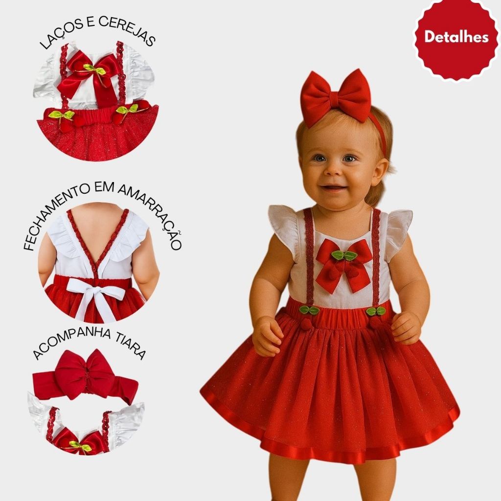 Jardineira Saia Infantil Bebê Festa Temática Cereja Laço Brilho Acompanha Tiara Menina Luxo Elegante