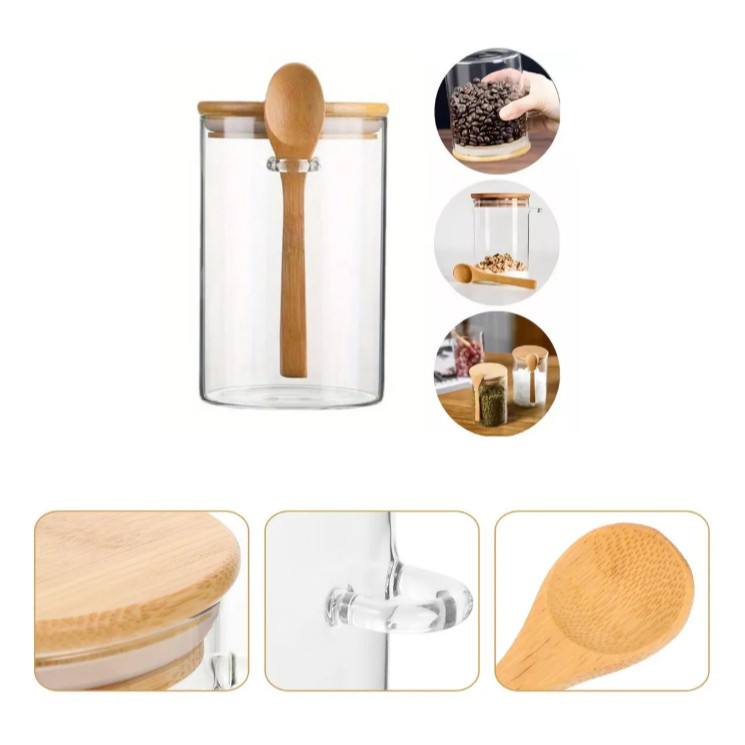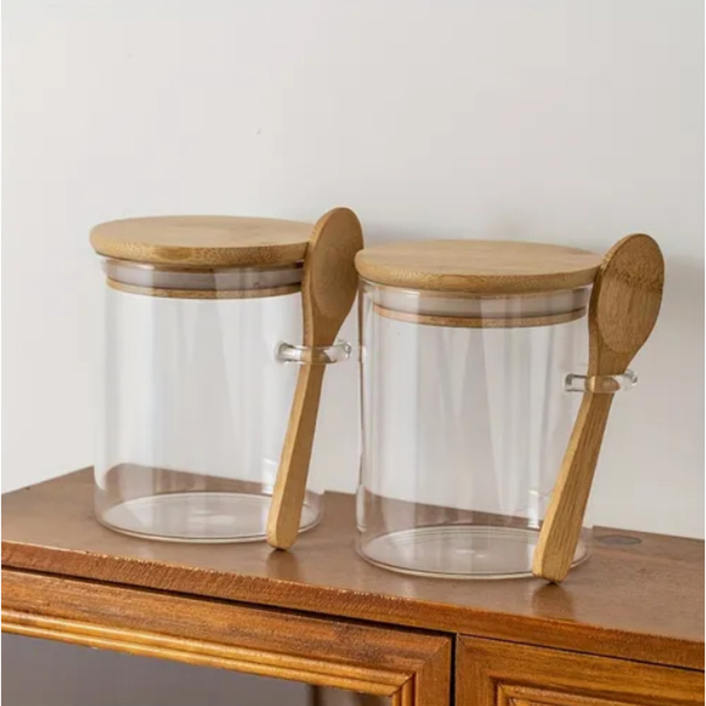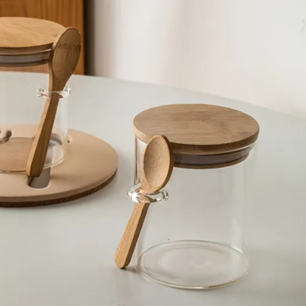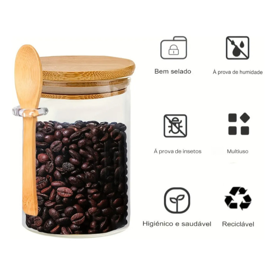 Kit 2 Pote De Vidro Hermético Redondo Com Colher Tampa Bambu