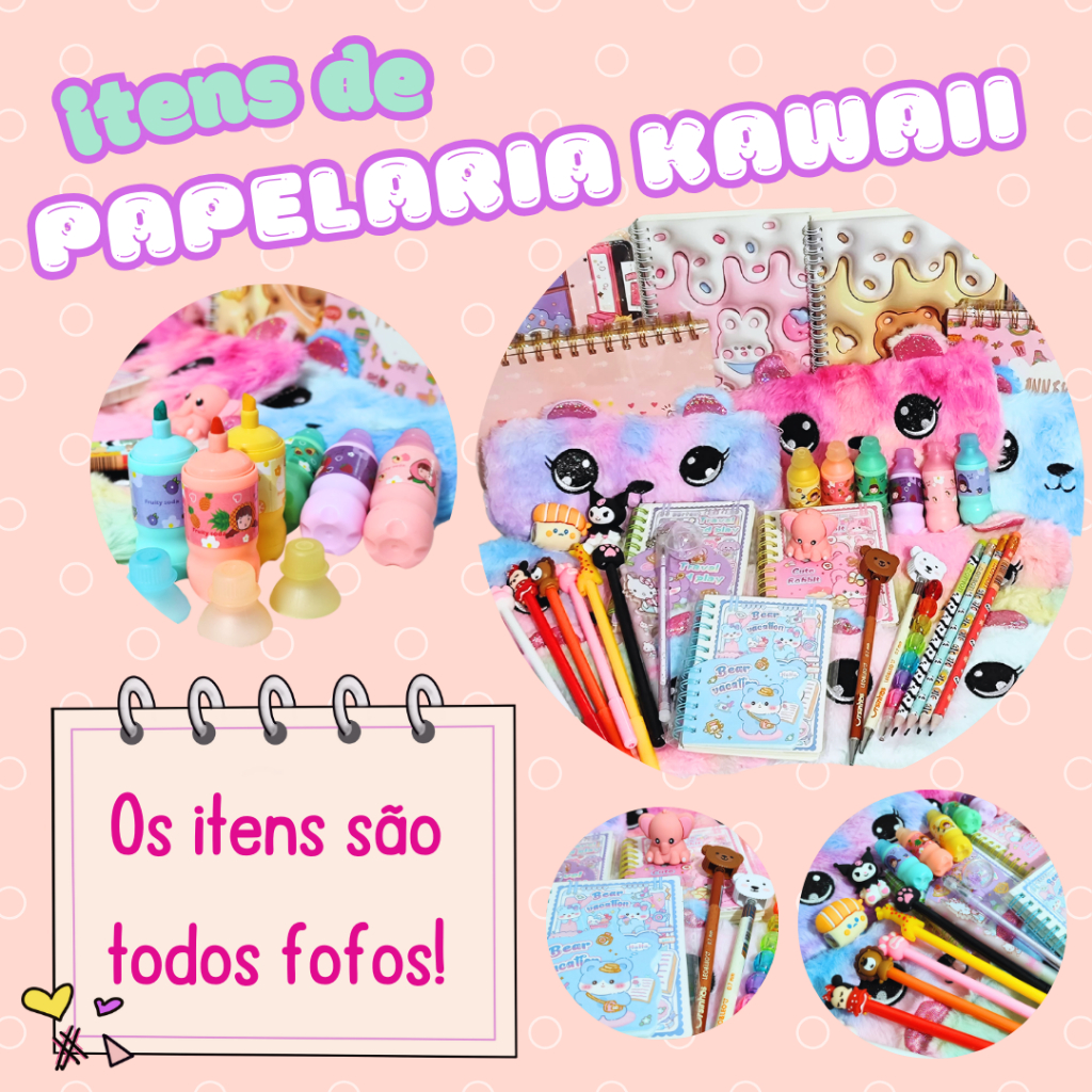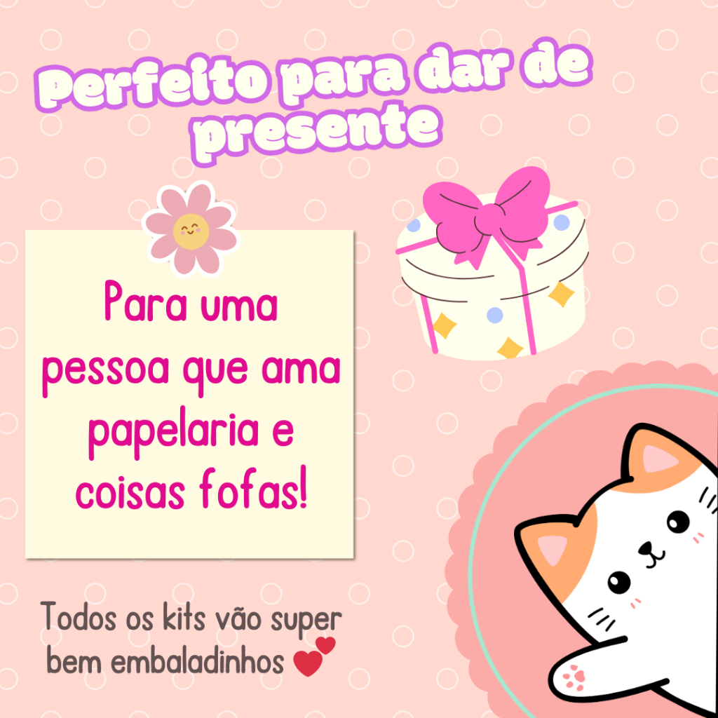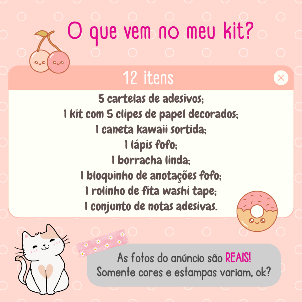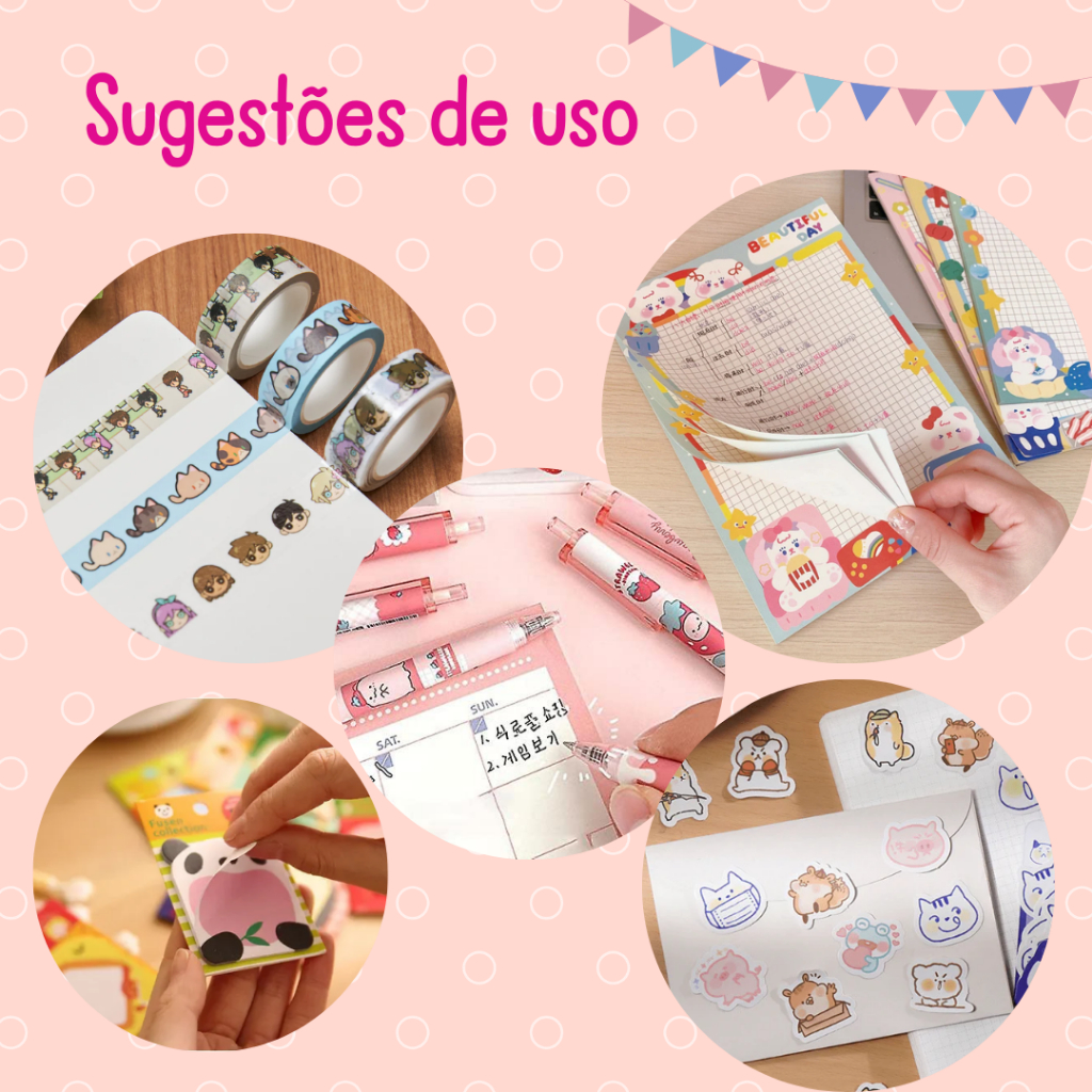 Kit Papelaria Kawaii 12 Itens Fofos Bloquinho Adesivos Clipes Washi Tape