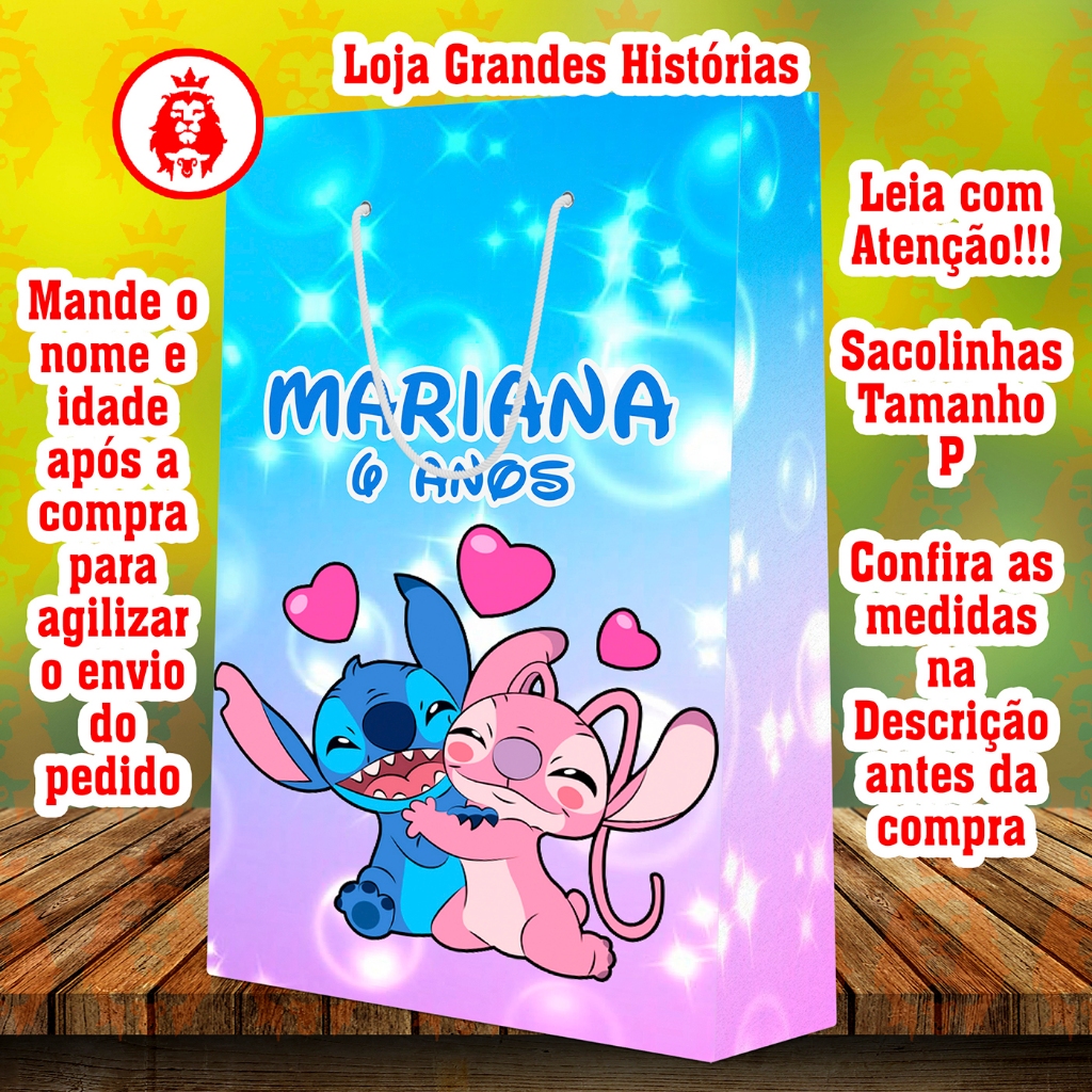 Sacolinhas Personalizadas - Angel e Stitch 1 - Lembrancinhas Infantil Premium com Nome e Idade - KIT PEGUE E MONTE