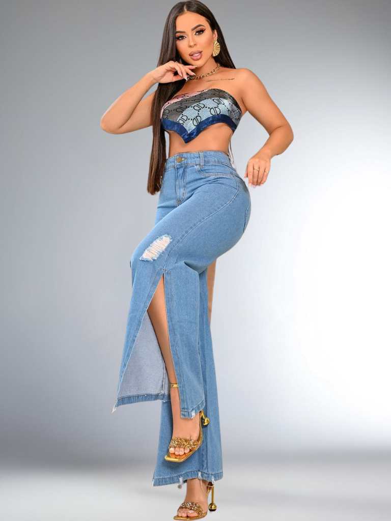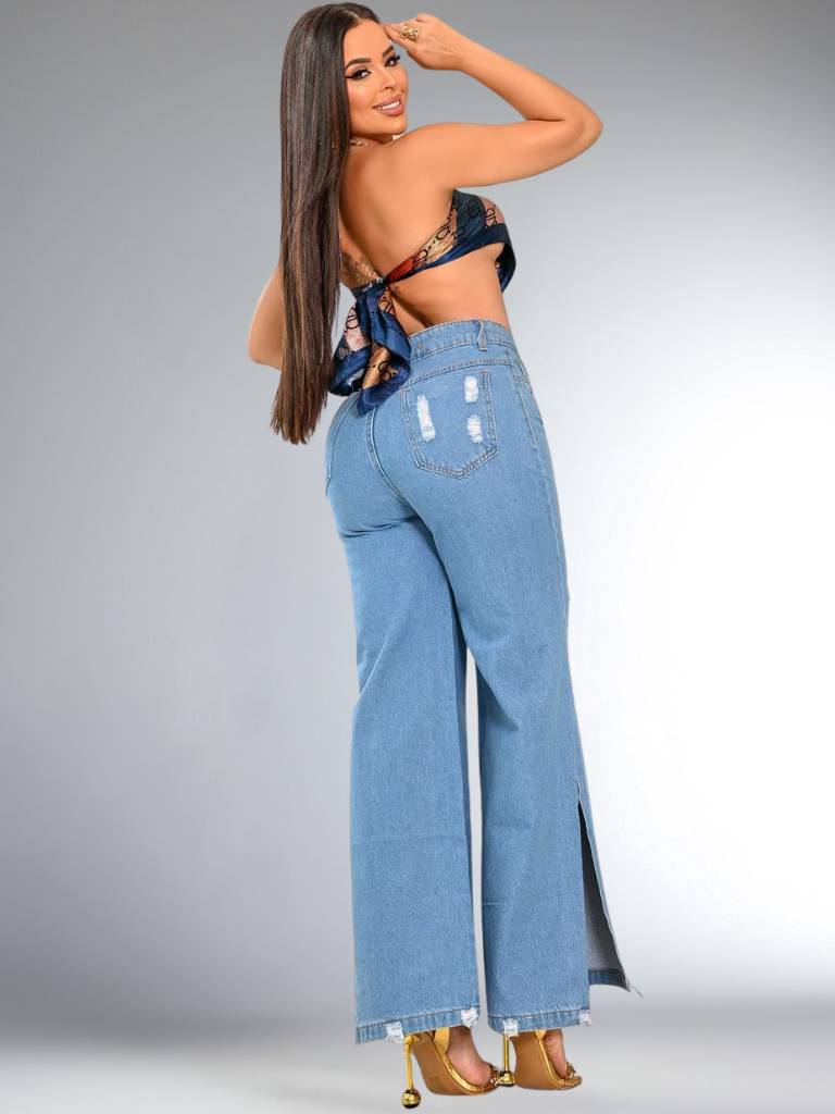 Calça Feminina Jeans Wide Leg Abertura na Barra 100% Algodão Cintura Alta Premium Pantalona Perna Larga Cós Alto