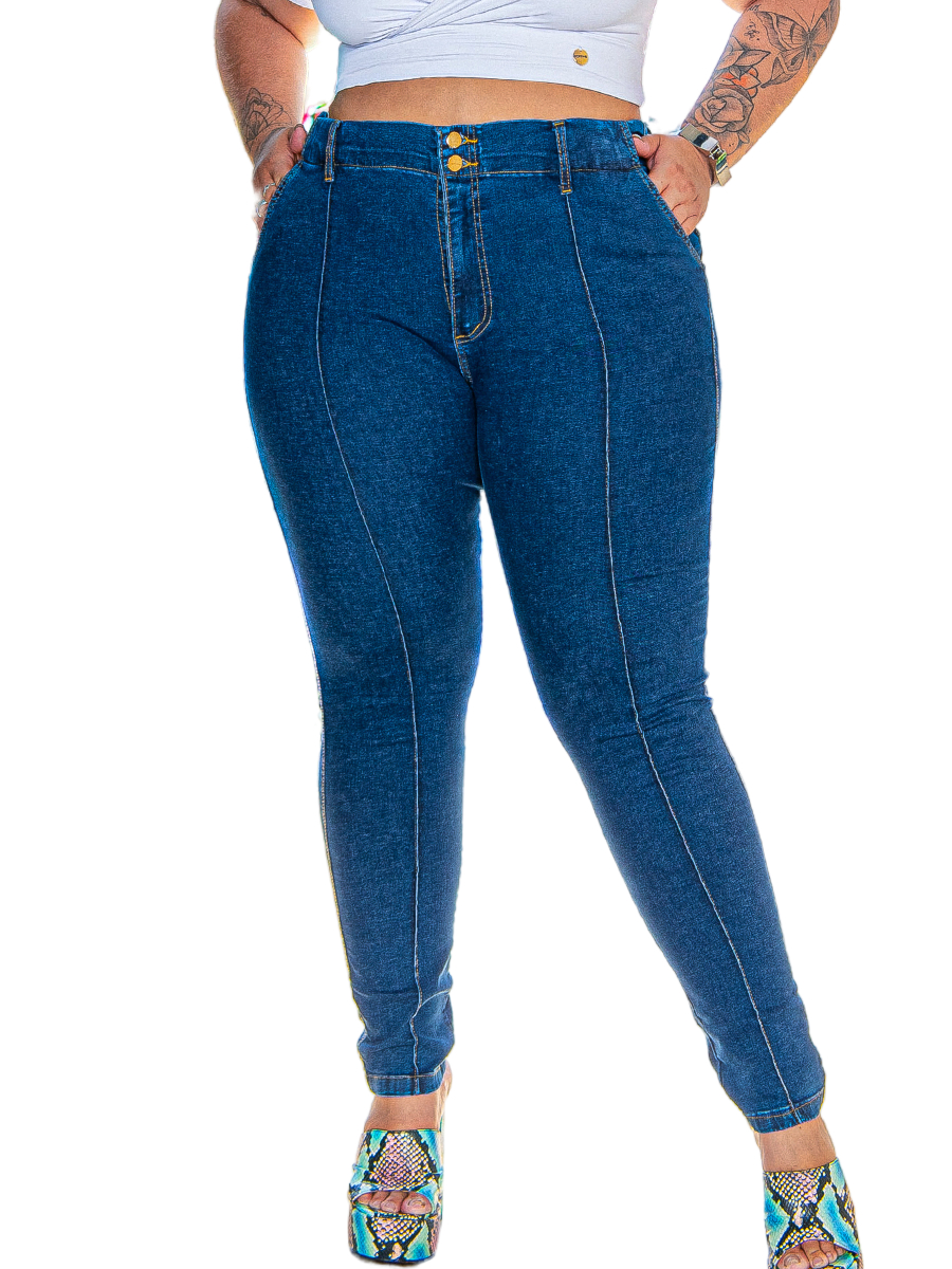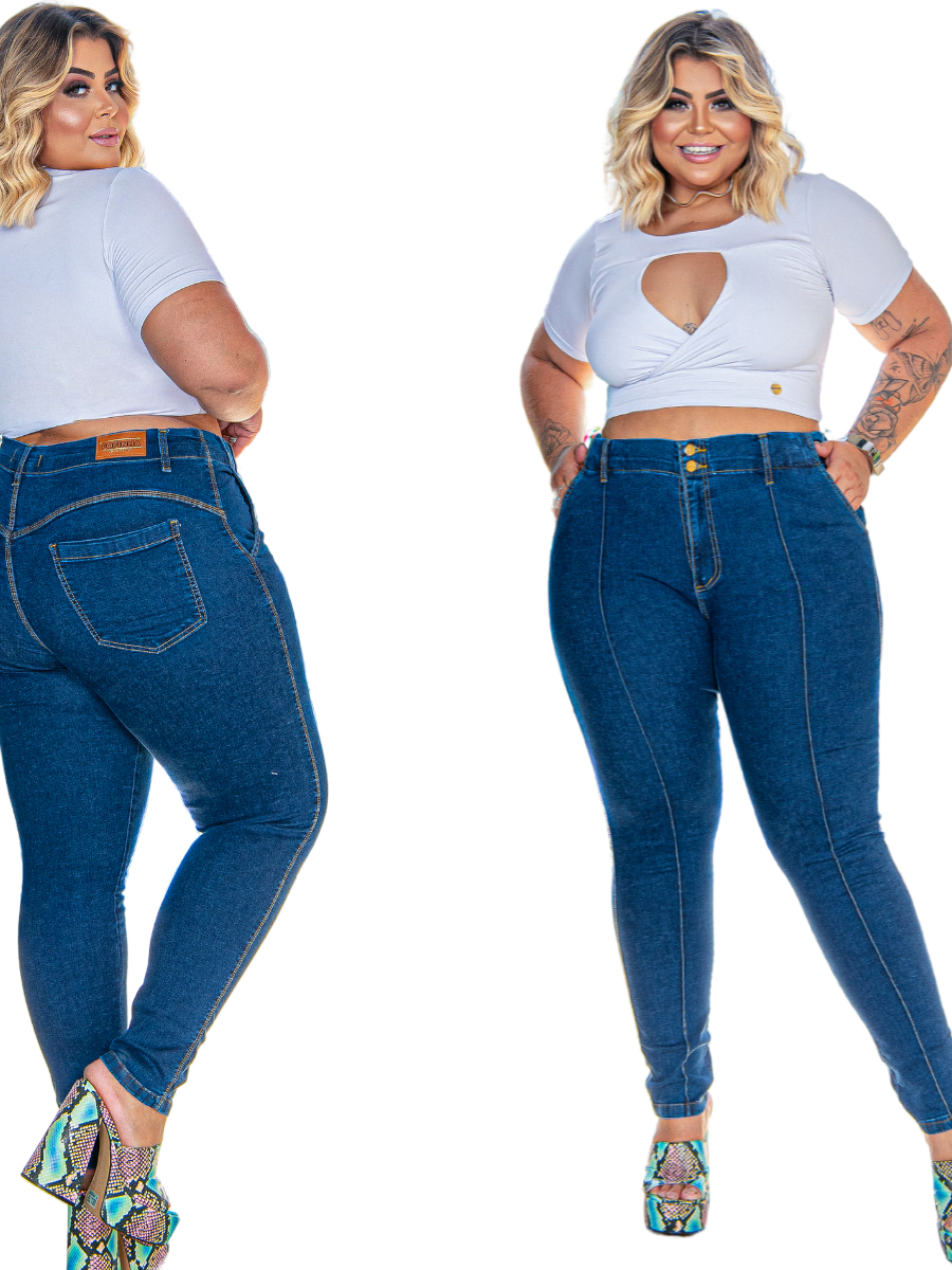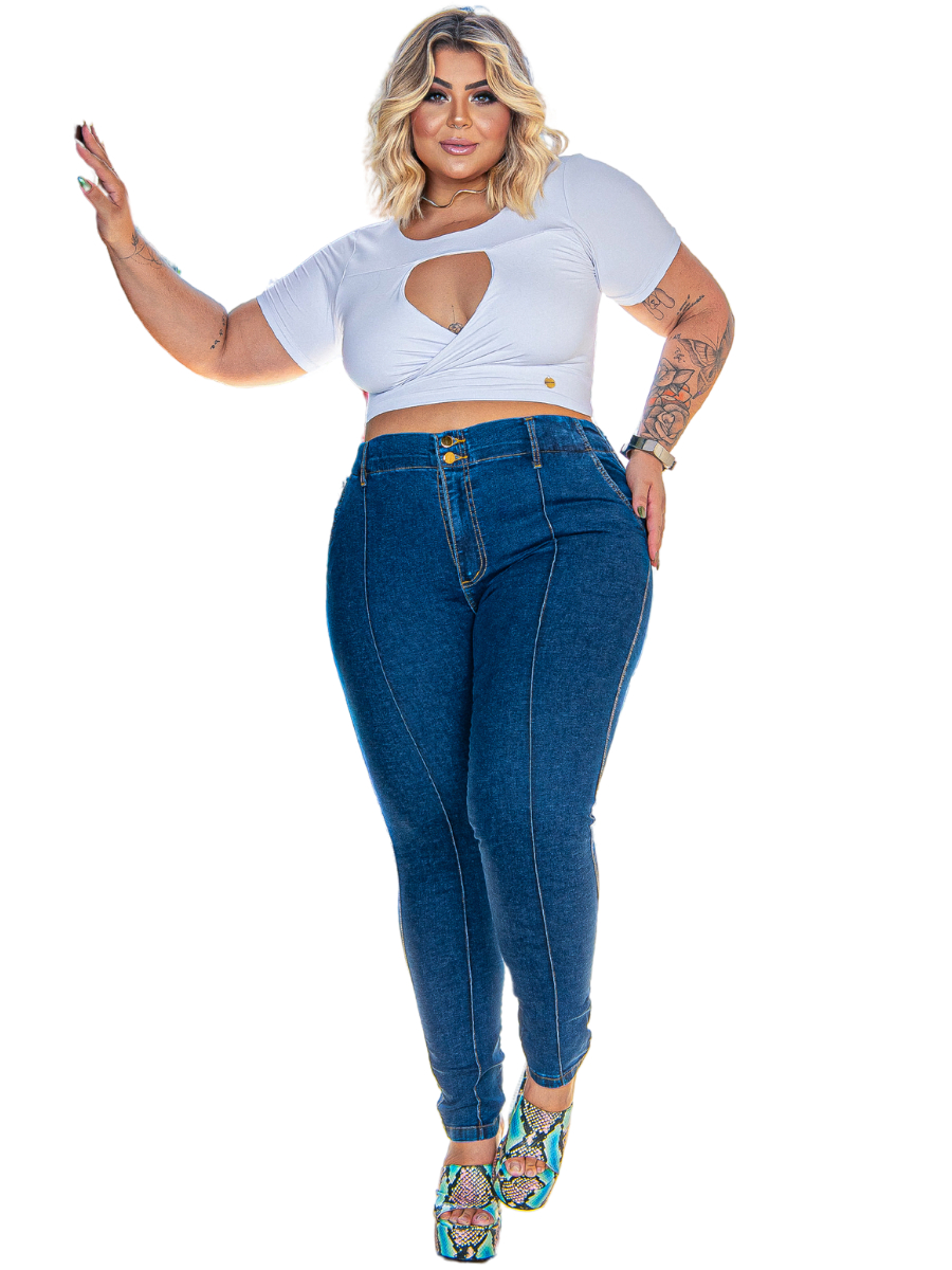 Calça Feminina Jeans Plus Size Fenda Frontal Com Elastano