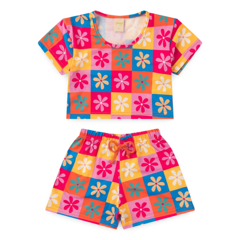 Conjunto Verão Menina Infantil Cropped e Shorts Com Cadarço Florido