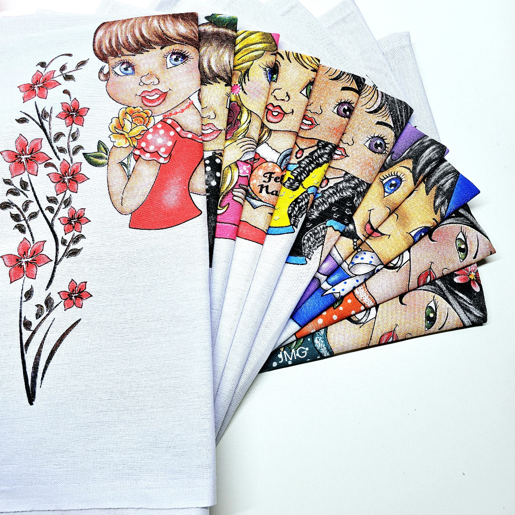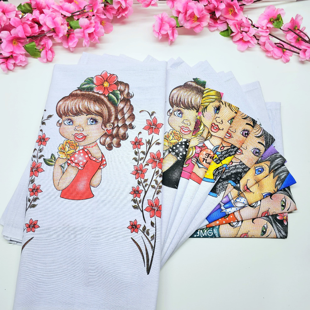 Kit 5 Panos de Prato BONEQUINHAS Misto 73x50cm Nova Era 100% Algodão Decoraçao Artesanato