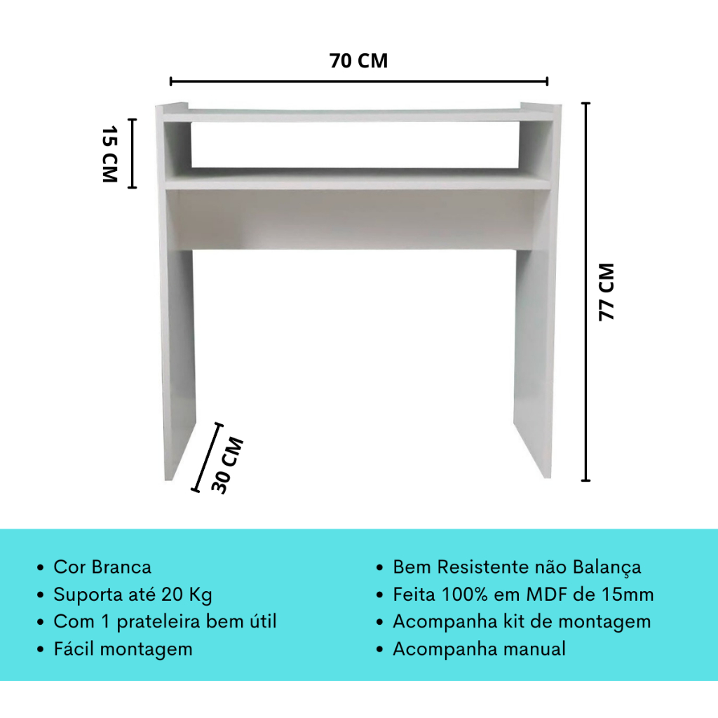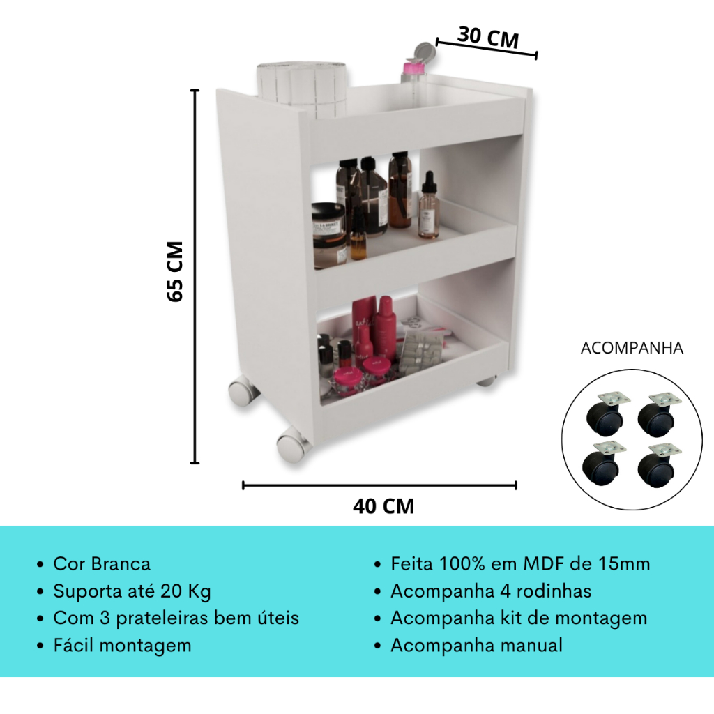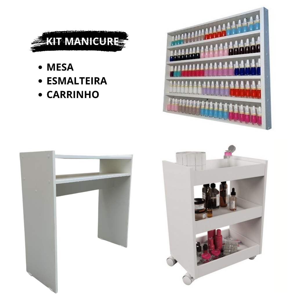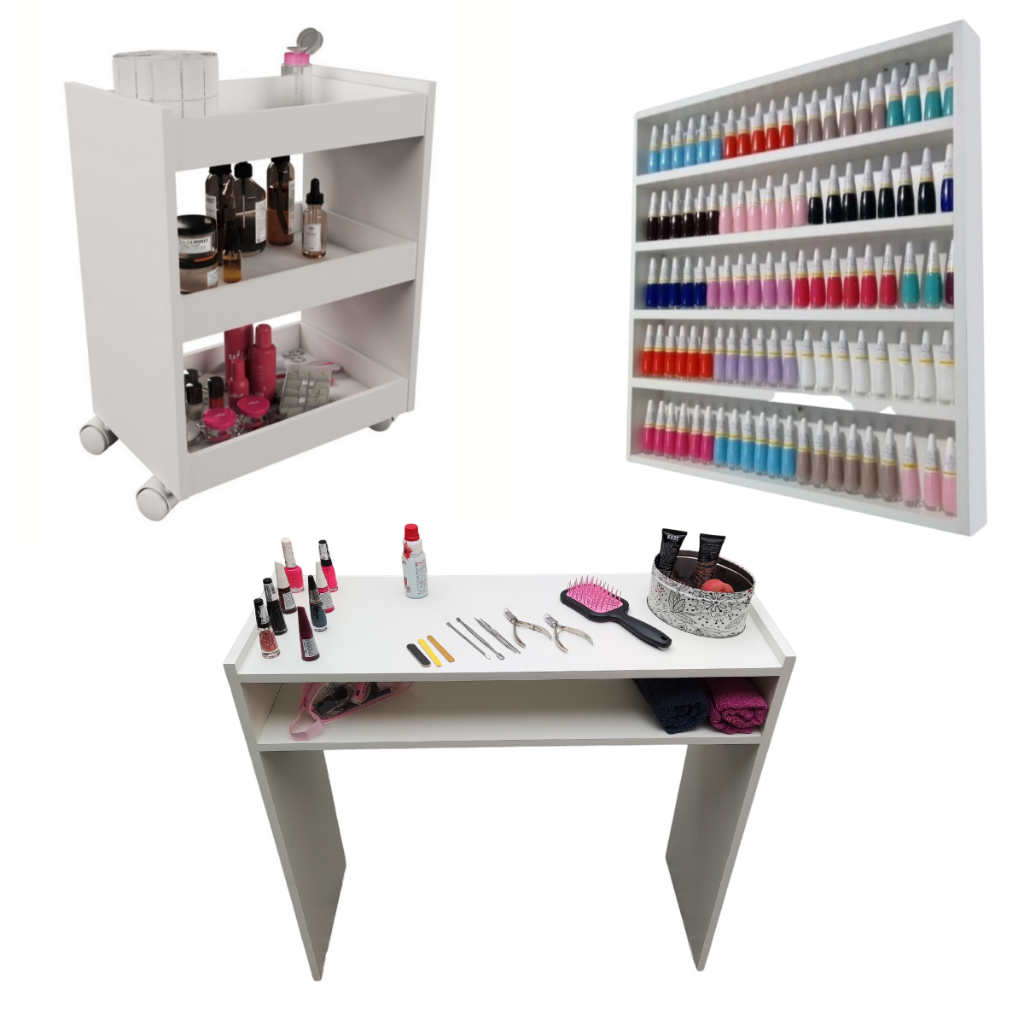 Kit Para Manicure Com Mesa + Prateleira de Esmaltes + Carrinho Auxiliar com 3 Bandejas