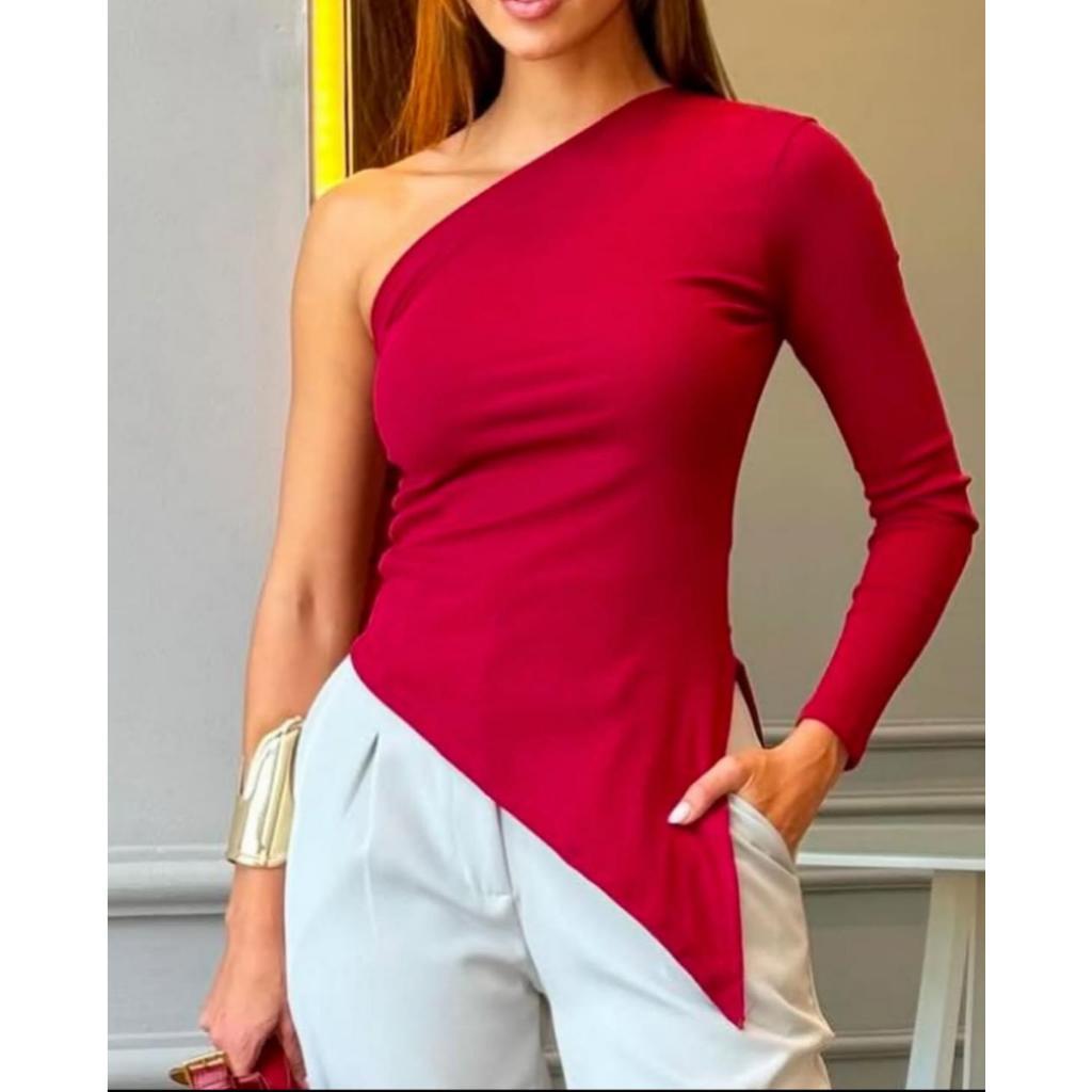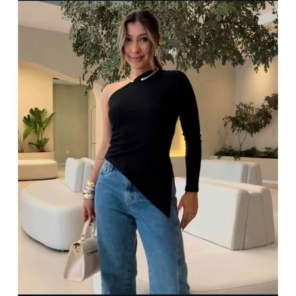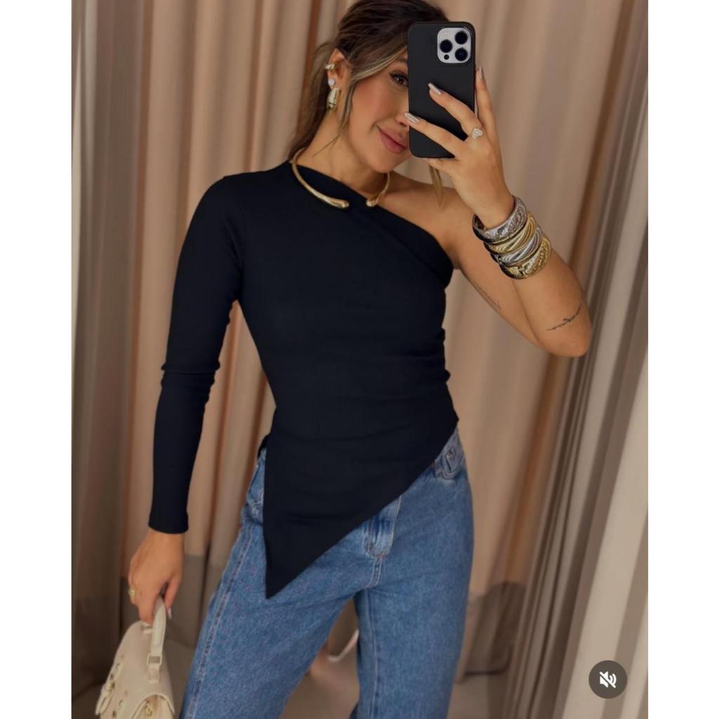 Blusa feminina nula, manga longa, assimétrica de um ombro só, ribana canelada – moda tendência