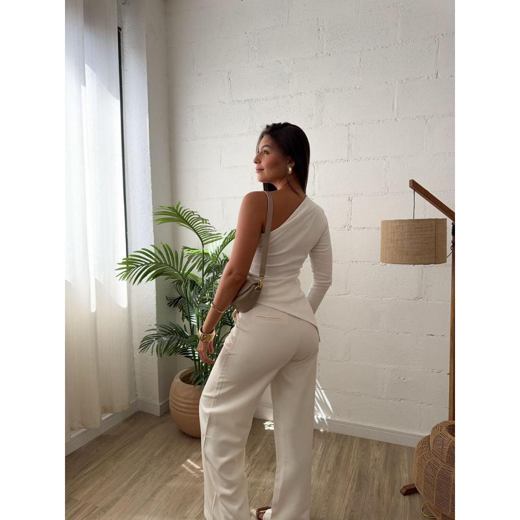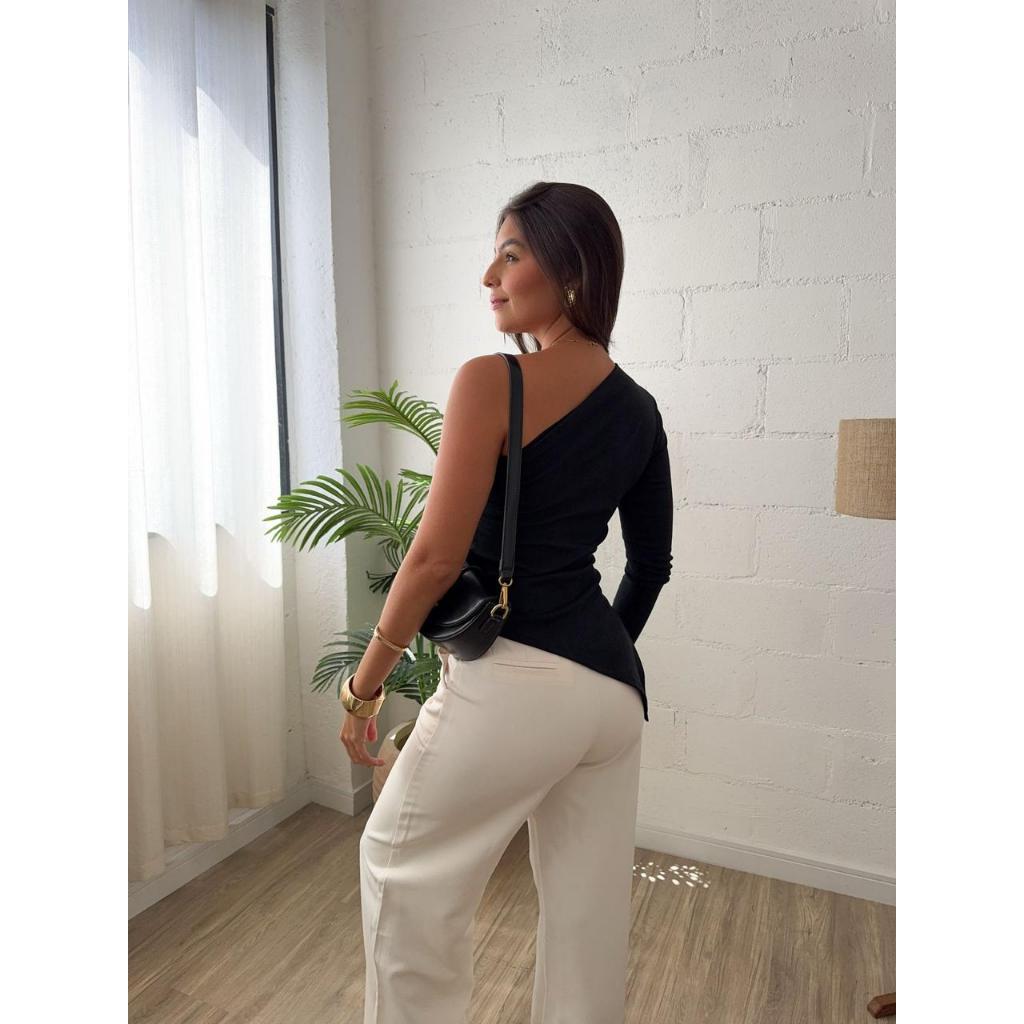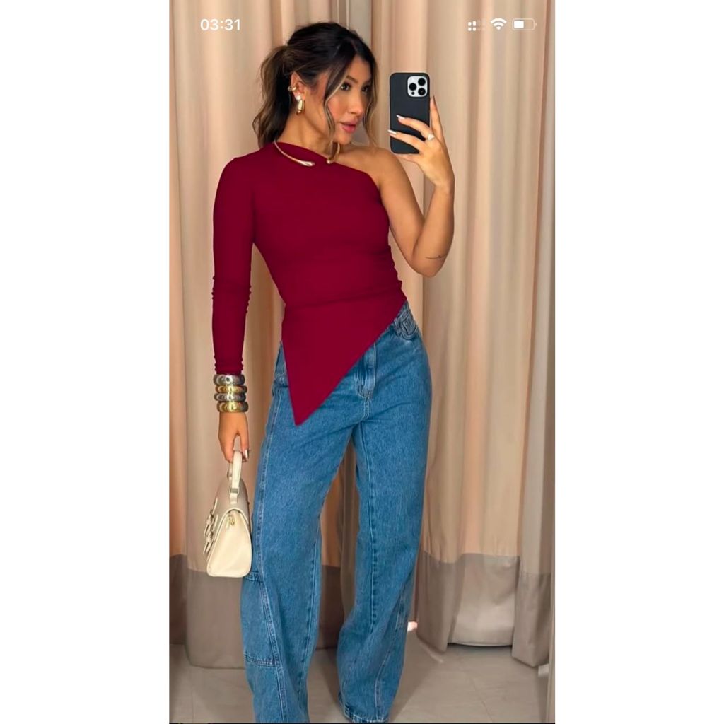 Blusa feminina nula, manga longa, assimétrica de um ombro só, ribana canelada – moda tendência
